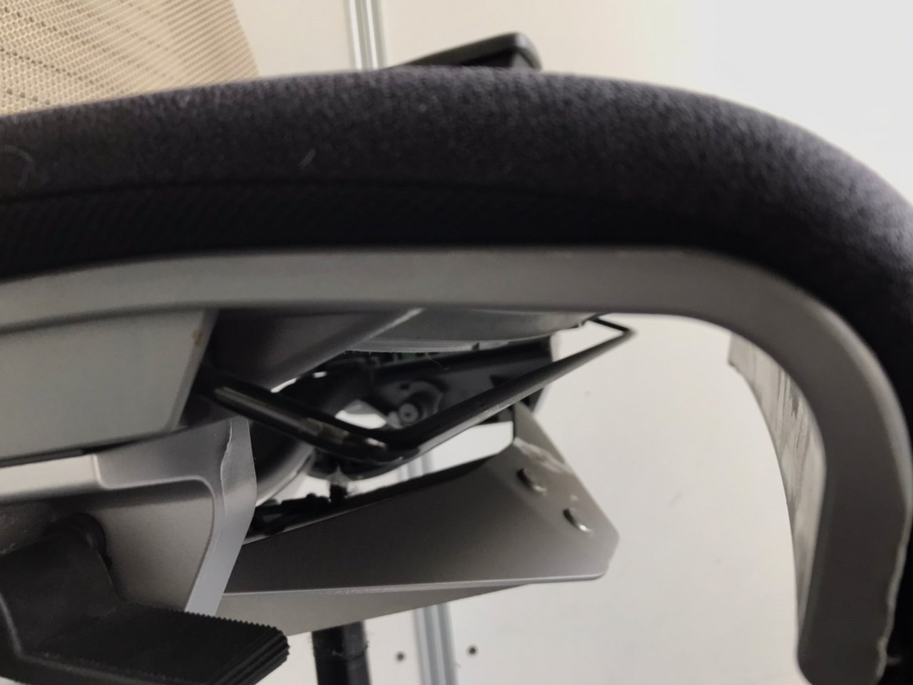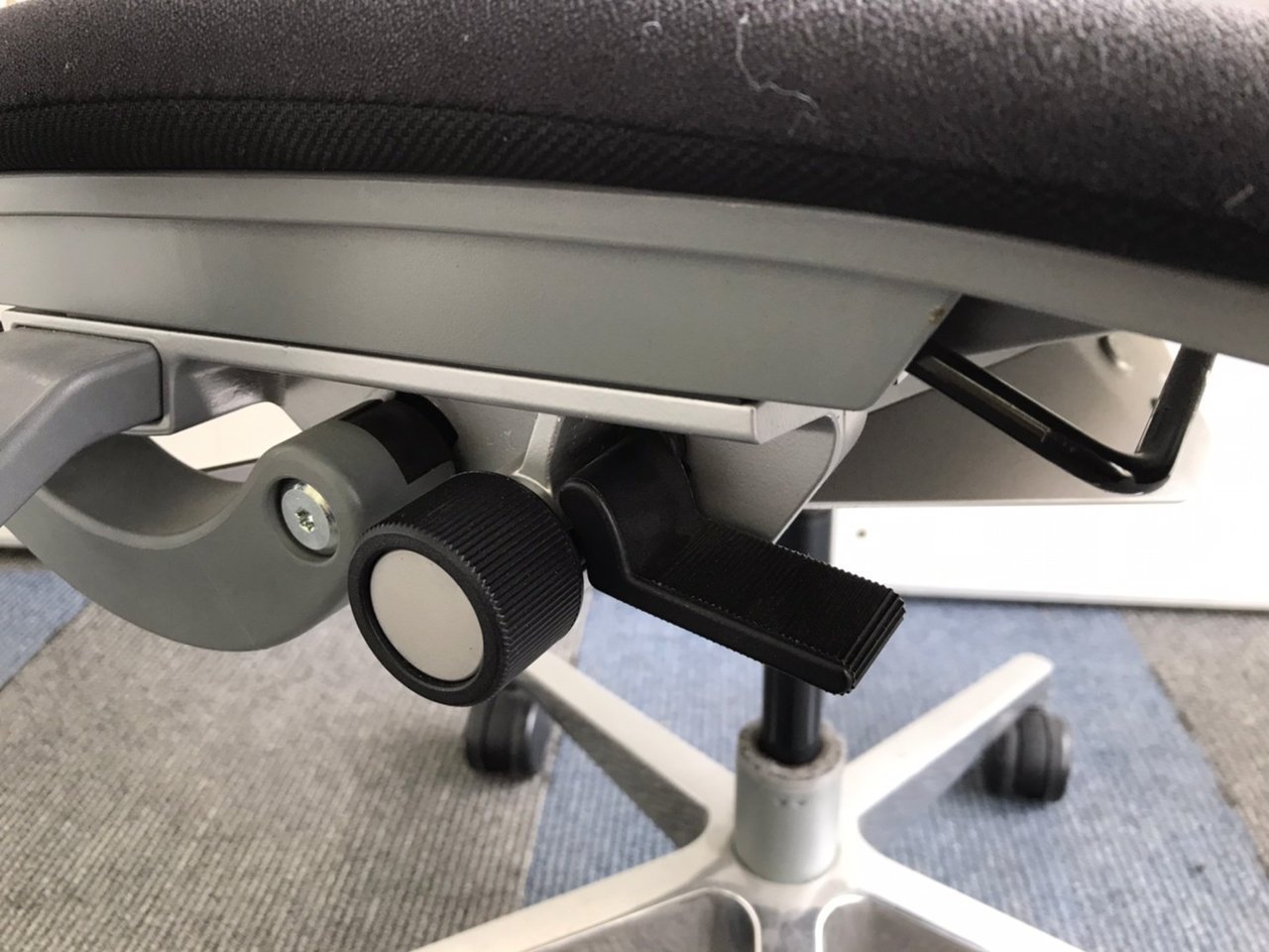 - レバーを引き上げながら座面を前後にスライドさせ、レバーを放すとロックします。背もたれに身体をつけた状態で膝の裏側と座面のエッジの間に5-8センチほどの隙間ができるのが理想的です。