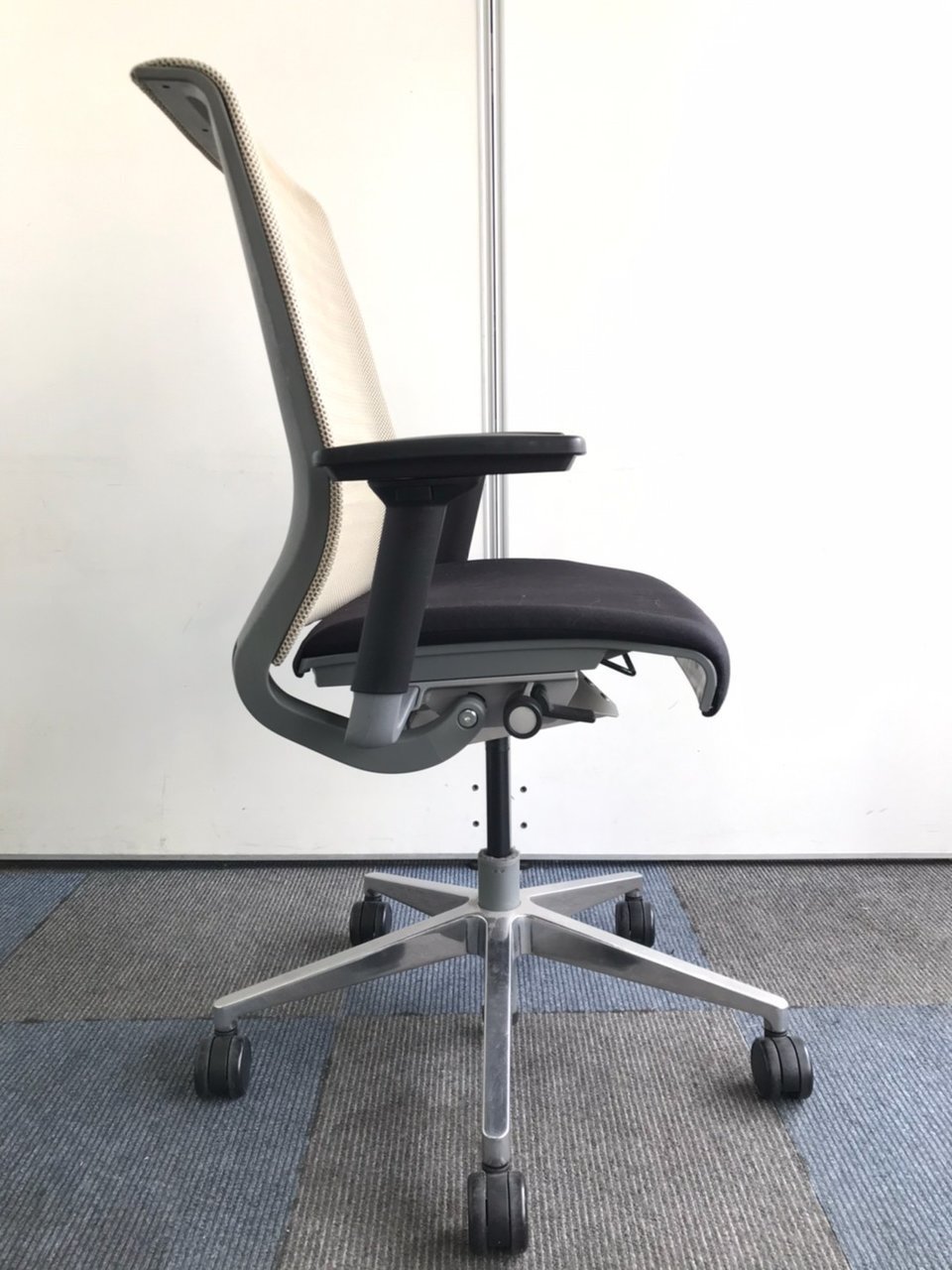 快適な座り心地に不可欠な調節機能である、上下昇降、座面の奥行き調整、リクライニングなどを備えており、操作もわかりやすく好評です。 特に、座面の奥行きは、座面下の左右に通った細いバーで調整でき、座ったままで軽やかに滑るように調整が可能です。 価格面では、新品では高めですが、中古は流通も多く、定価の3割前後の価格で高級チェアの座り心地を手に入れることができます!