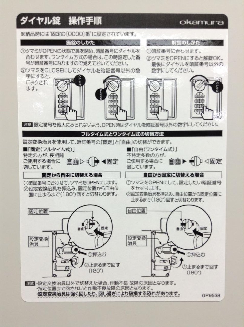 ※ダイヤル番号がわからなくなった場合の、番号検索キー(マスターキー)は付属されておりません。