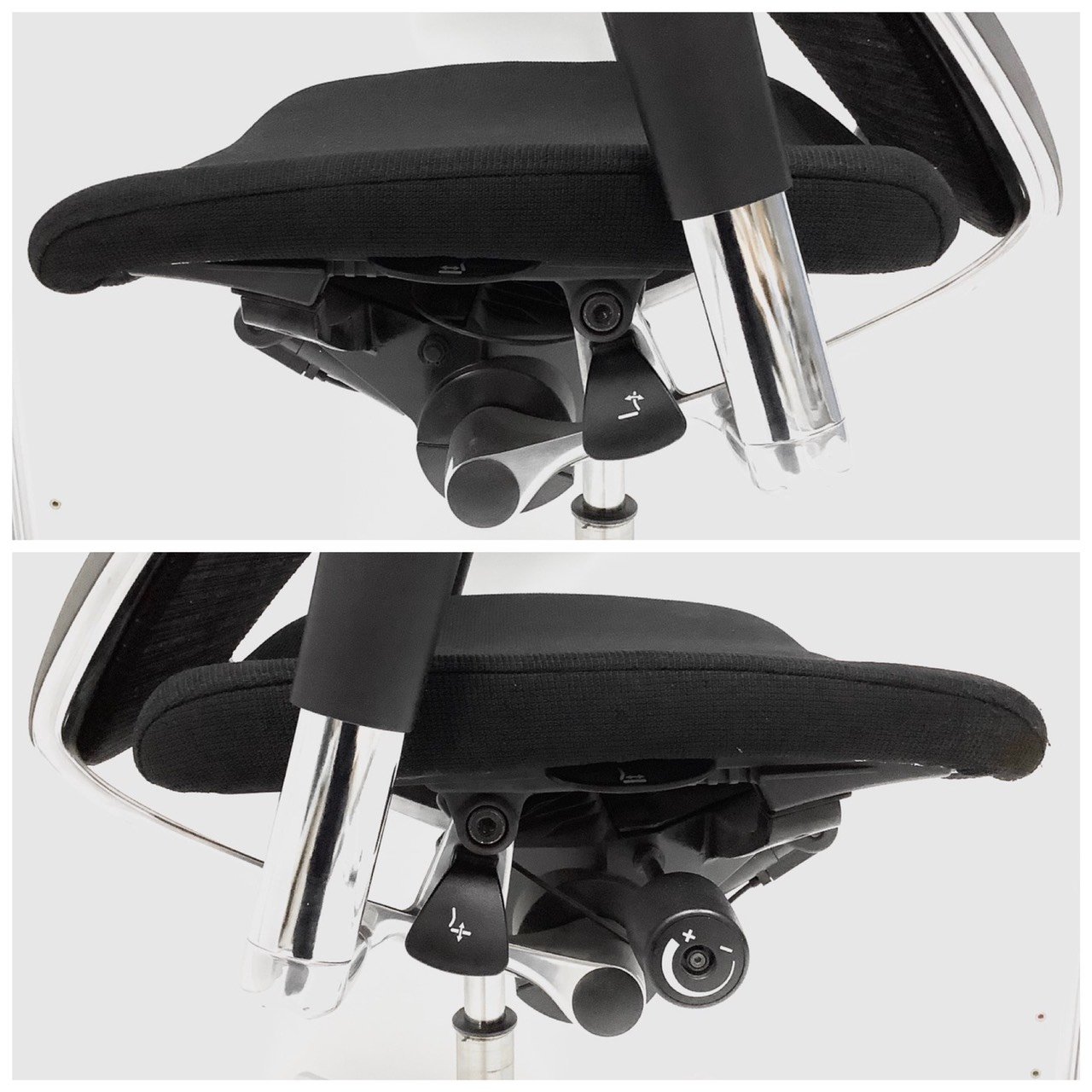 もちろん座り心地もコンテッサの直系ですから快適です。座面の素材はクッションとメッシュの2タイプあります。私、個人的には座面の中心部分でも外側でもテンションが変わらないクッション素材が、足を閉じても開いても快適なので推しです!"