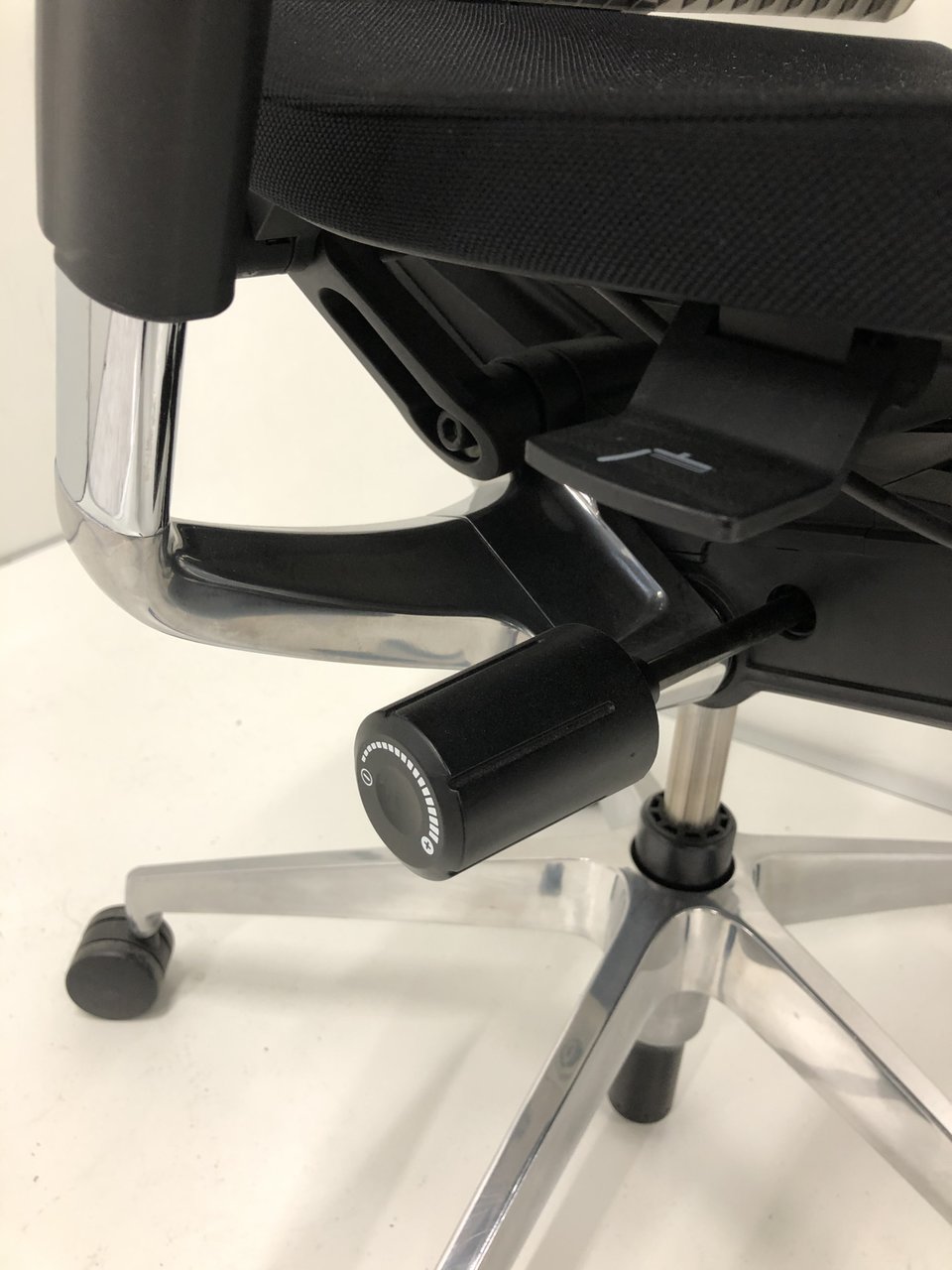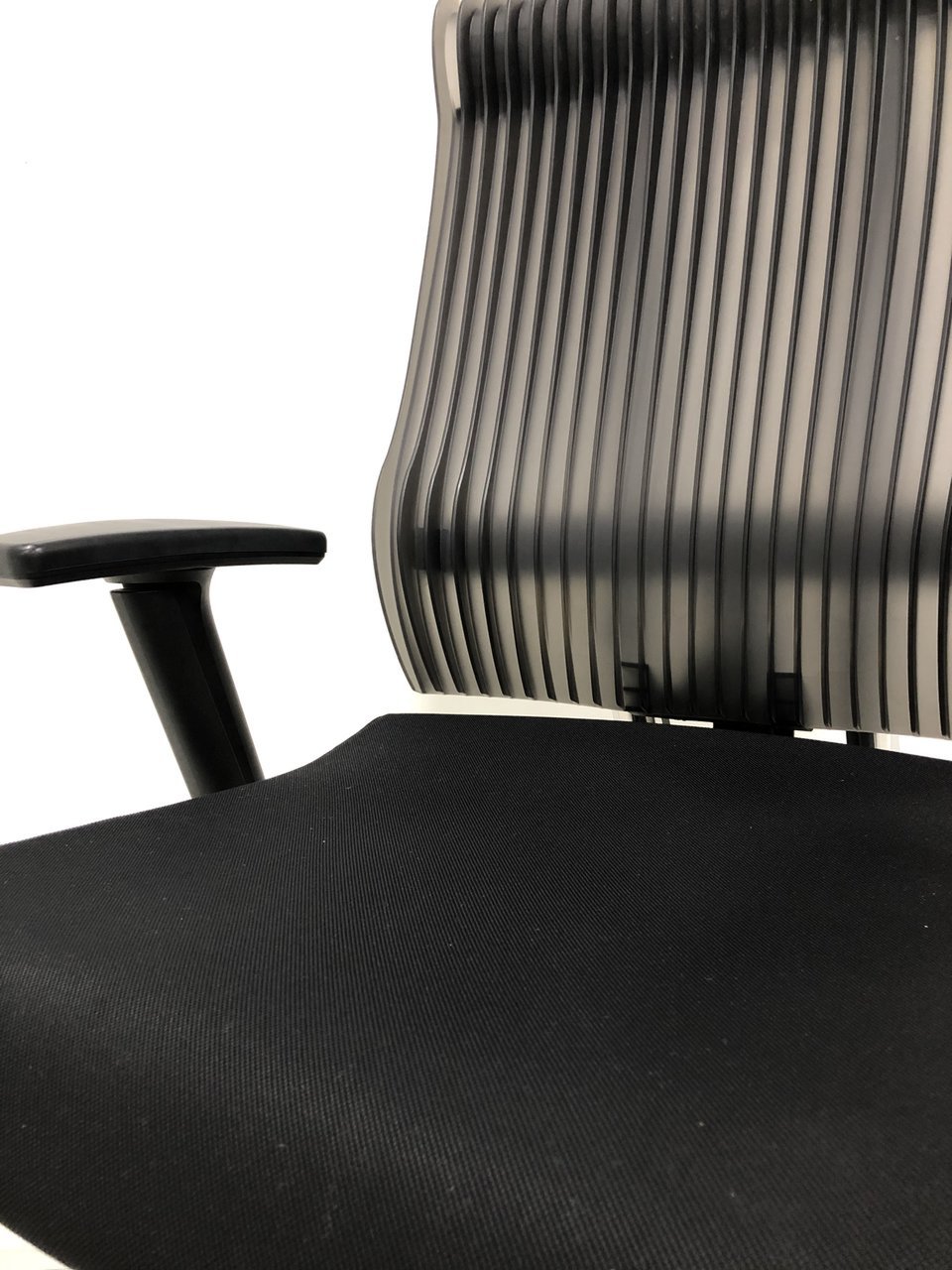 見た目は少し硬そうに見えるエラストマー素材ですが、座ってみると程よいしなり具合のやわらかな座り心地で、背中が痛くなるようなことはまるでありません。面ではなく線で支えることで、背面の通気性の良さは抜群です。
