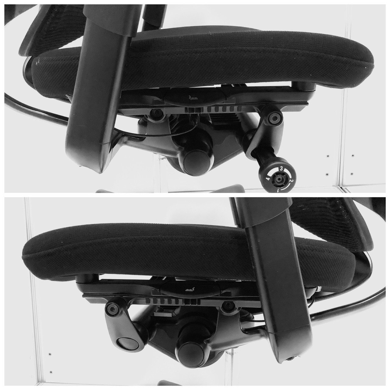 - 座面の前後スライド調整レバーで操作(前後50mm分調整で)できます。(グラデーションサポートメッシュタイプを除く)