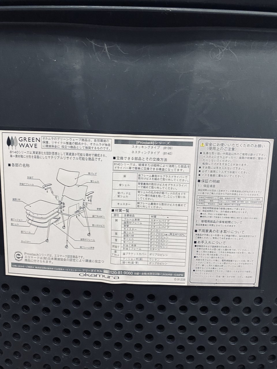 【座面使用感あり】オカムラ製 プロスタック プレーンタイプ 背面樹脂メッシュ ブルー×ブラック コンパクトに積み重ねて収納 ネスティングチェア!!