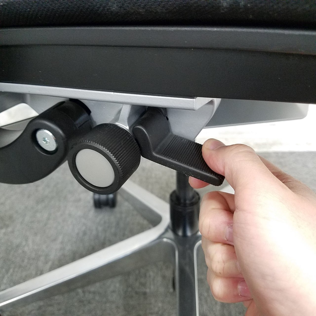 - レバーを引き上げながら座面を前後にスライドさせ、レバーを放すとロックします。背もたれに身体をつけた状態で膝の裏側と座面のエッジの間に5-8センチほどの隙間ができるのが理想的です。