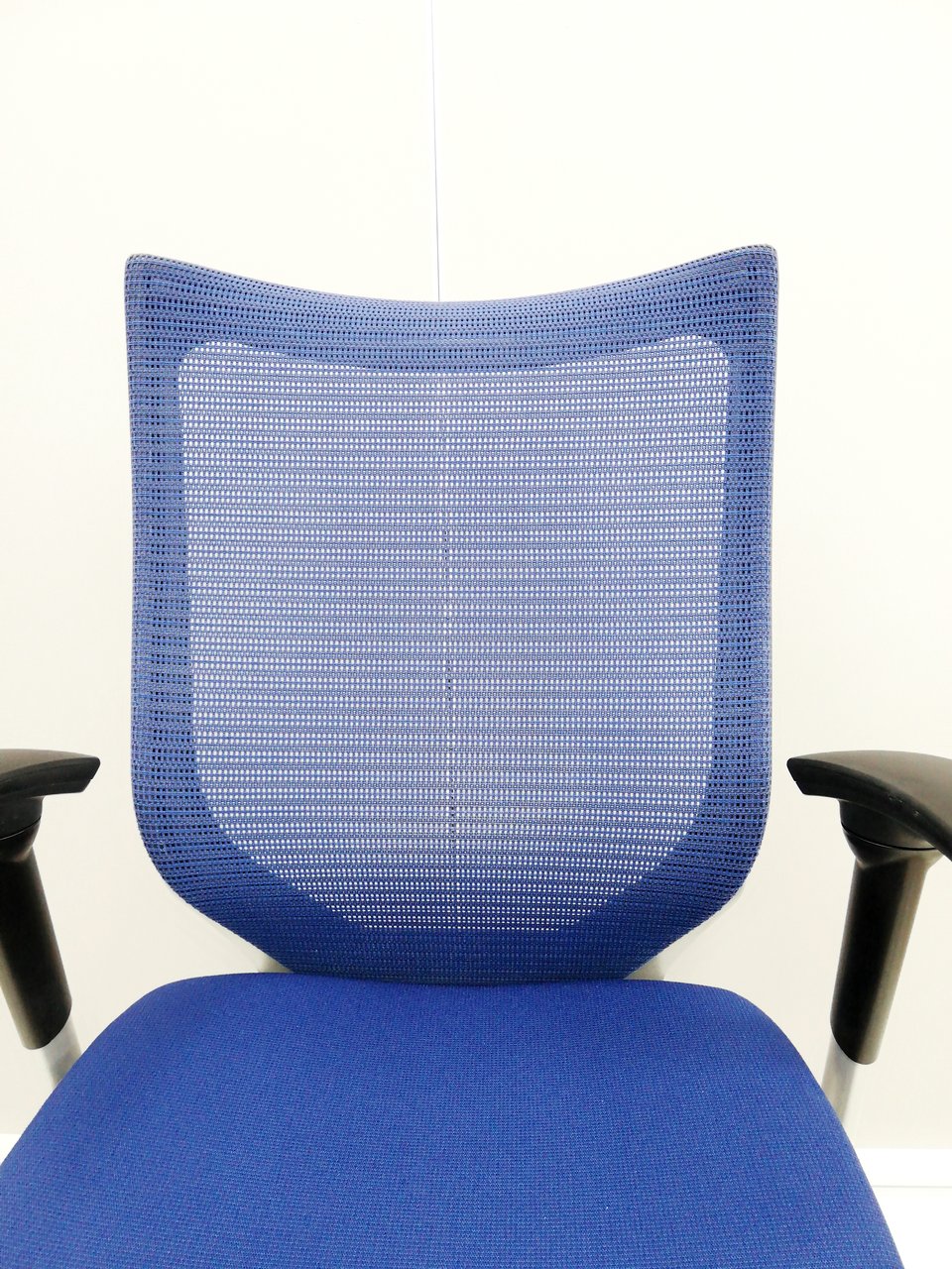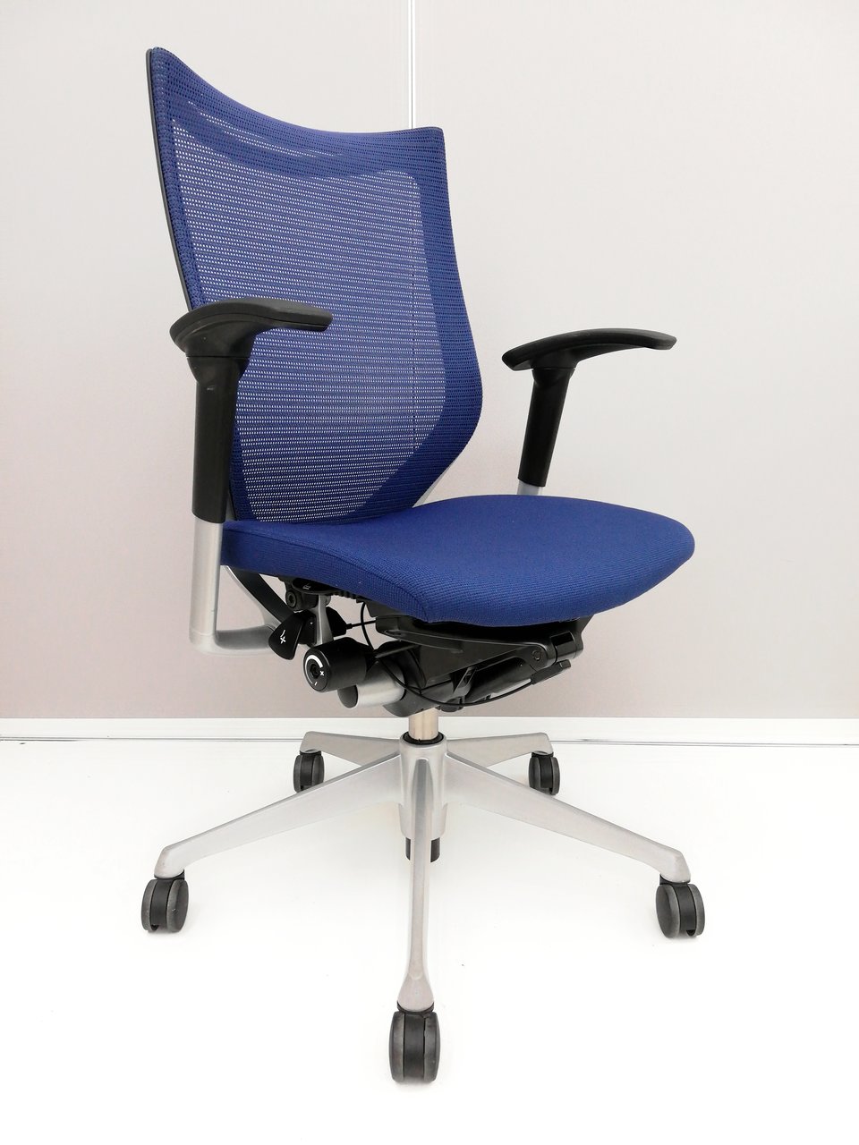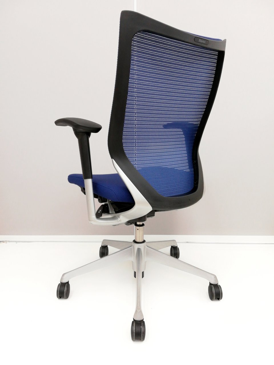 【オフィスの執務室、会議室におすすめ!】■オカムラ(okamura)製 バロン(Baron)チェア 肘付き ハイバック 背面メッシュ ■可動肘 ■ダークブルー × ホワイトシェル【硬めの座面が大人気!国産メッシュチェアの代表格!】【状態良好品!】