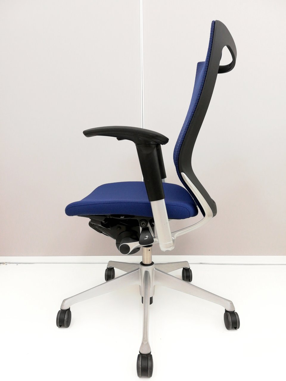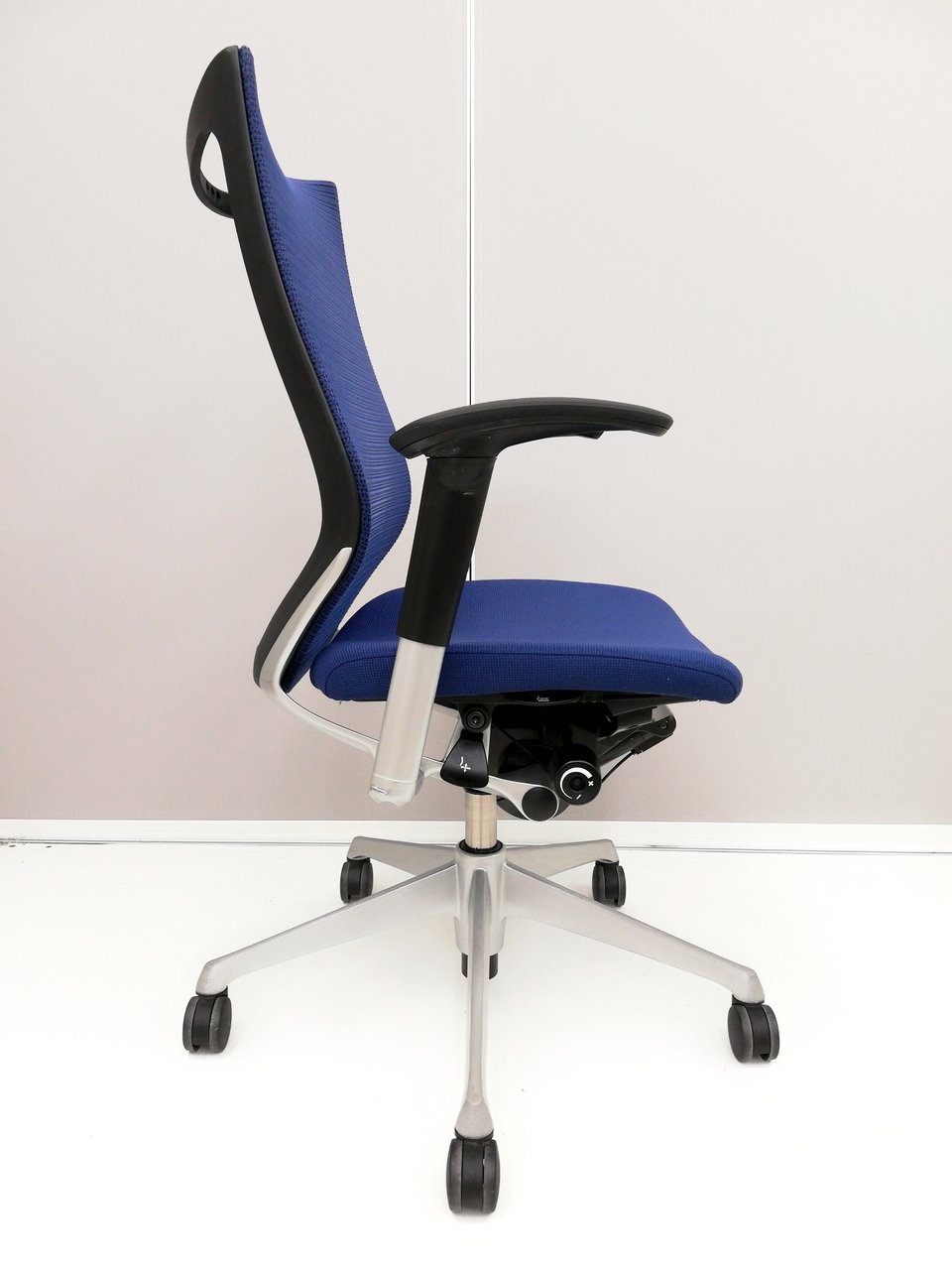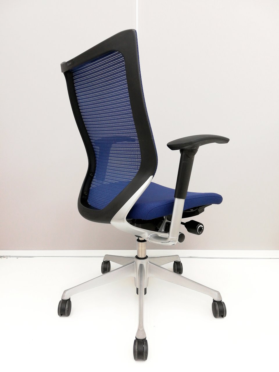 【オフィスの執務室、会議室におすすめ!】■オカムラ(okamura)製 バロン(Baron)チェア 肘付き ハイバック 背面メッシュ ■可動肘 ■ダークブルー × ホワイトシェル【硬めの座面が大人気!国産メッシュチェアの代表格!】【状態良好品!】