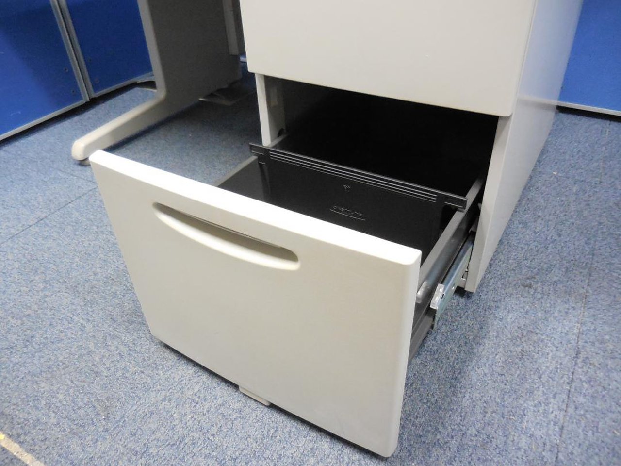 - 袖机のワゴンは、最下段がロング引出しになっており、従来より収納力120%アップ。