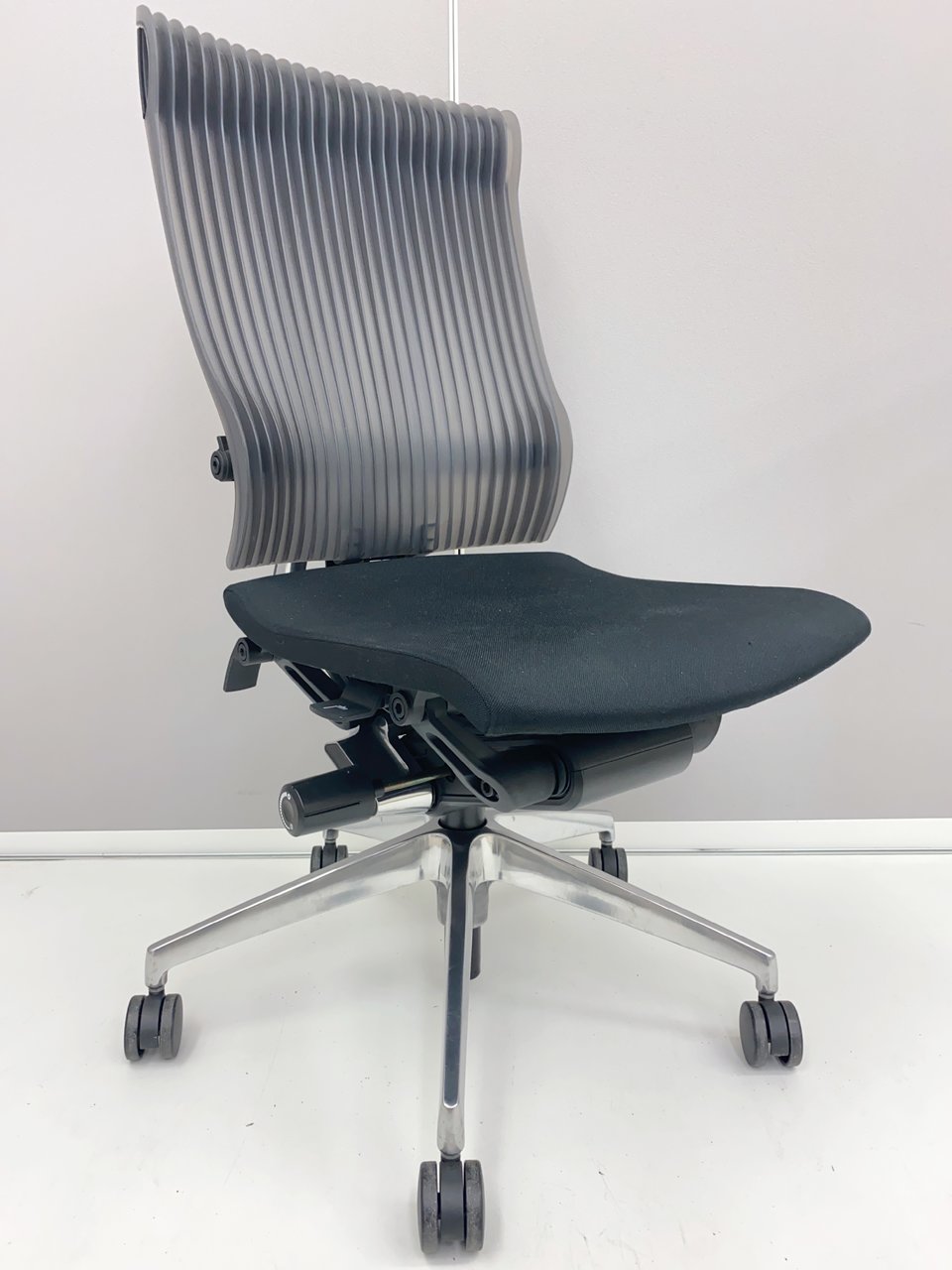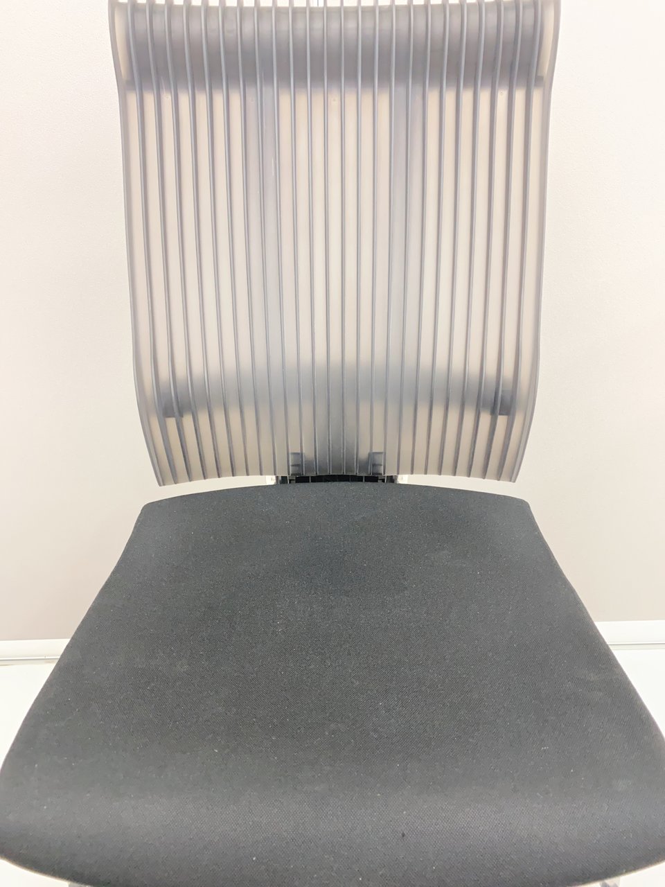 見た目は少し硬そうに見えるエラストマー素材ですが、座ってみると程よいしなり具合のやわらかな座り心地で、背中が痛くなるようなことはまるでありません。面ではなく線で支えることで、背面の通気性の良さは抜群です。