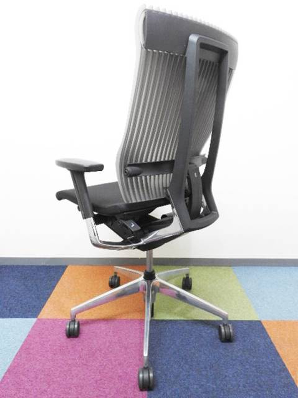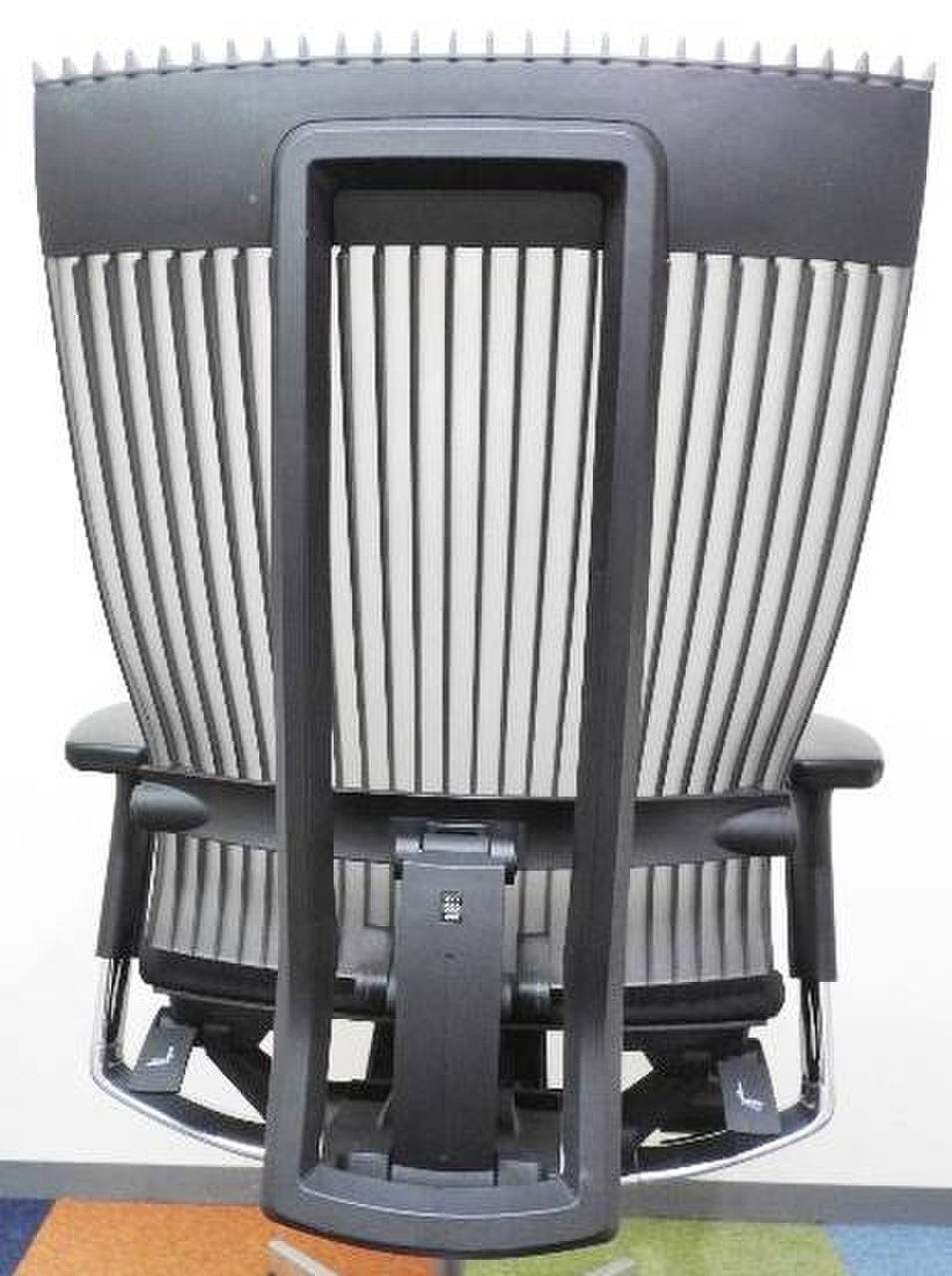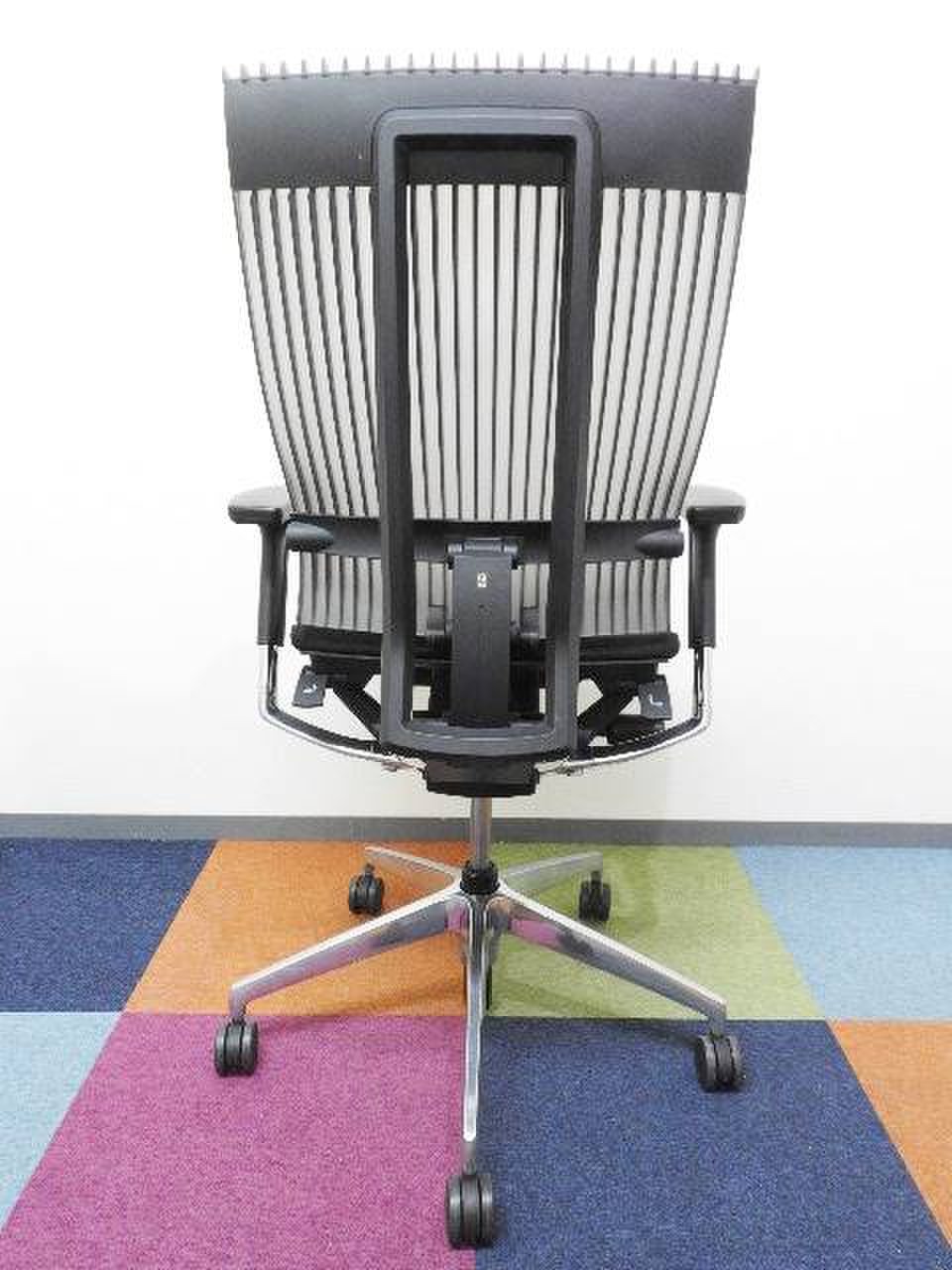 見た目は少し硬そうに見えるエラストマー素材ですが、座ってみると程よいしなり具合のやわらかな座り心地で、背中が痛くなるようなことはまるでありません。面ではなく線で支えることで、背面の通気性の良さは抜群です。
