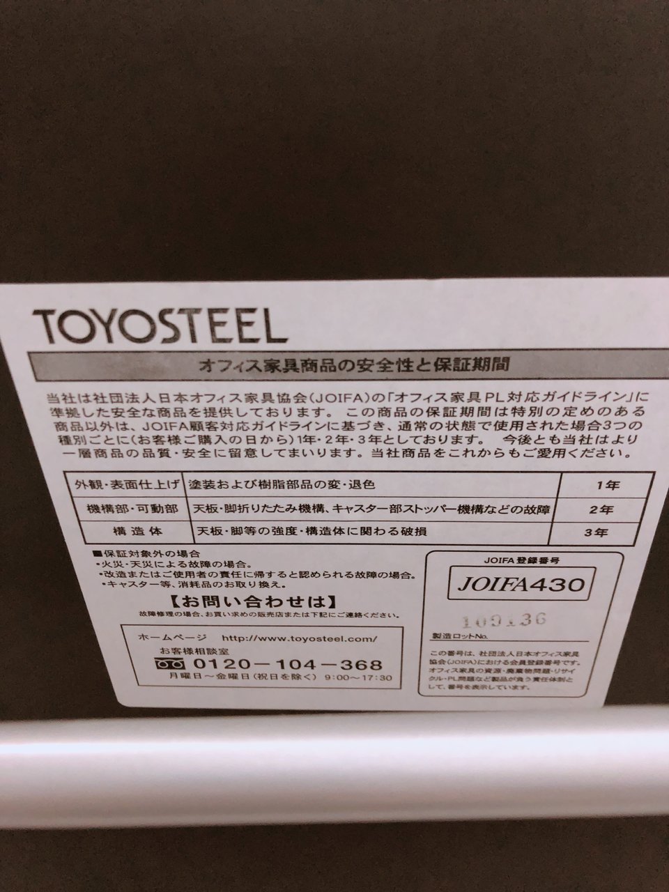 - 一部不具合あり天板歪み、アジャスター無し、キャスター使用不可ようなそのテーブルの本来の効用を果たすための機能以外の一部が使用不可な状態。(例、キャスターロッ ク機能使用不可、棚板無し等がある。)