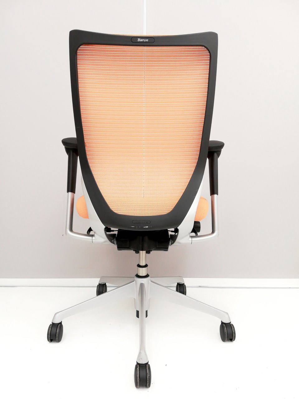 発売当時、既に人気を博していたオカムラの高級チェア、コンテッサから手元で座高調整ができるスマートオペレーション機能を取り除くなどしてリーズナブルにしたのがバロンです。その際に少しだけコンパクト化されました。そのことが、日本人の体格、日本のオフィス、家庭環境に適し、国内で多くのシェアを獲得する要因の一つになったのではないかと思います。