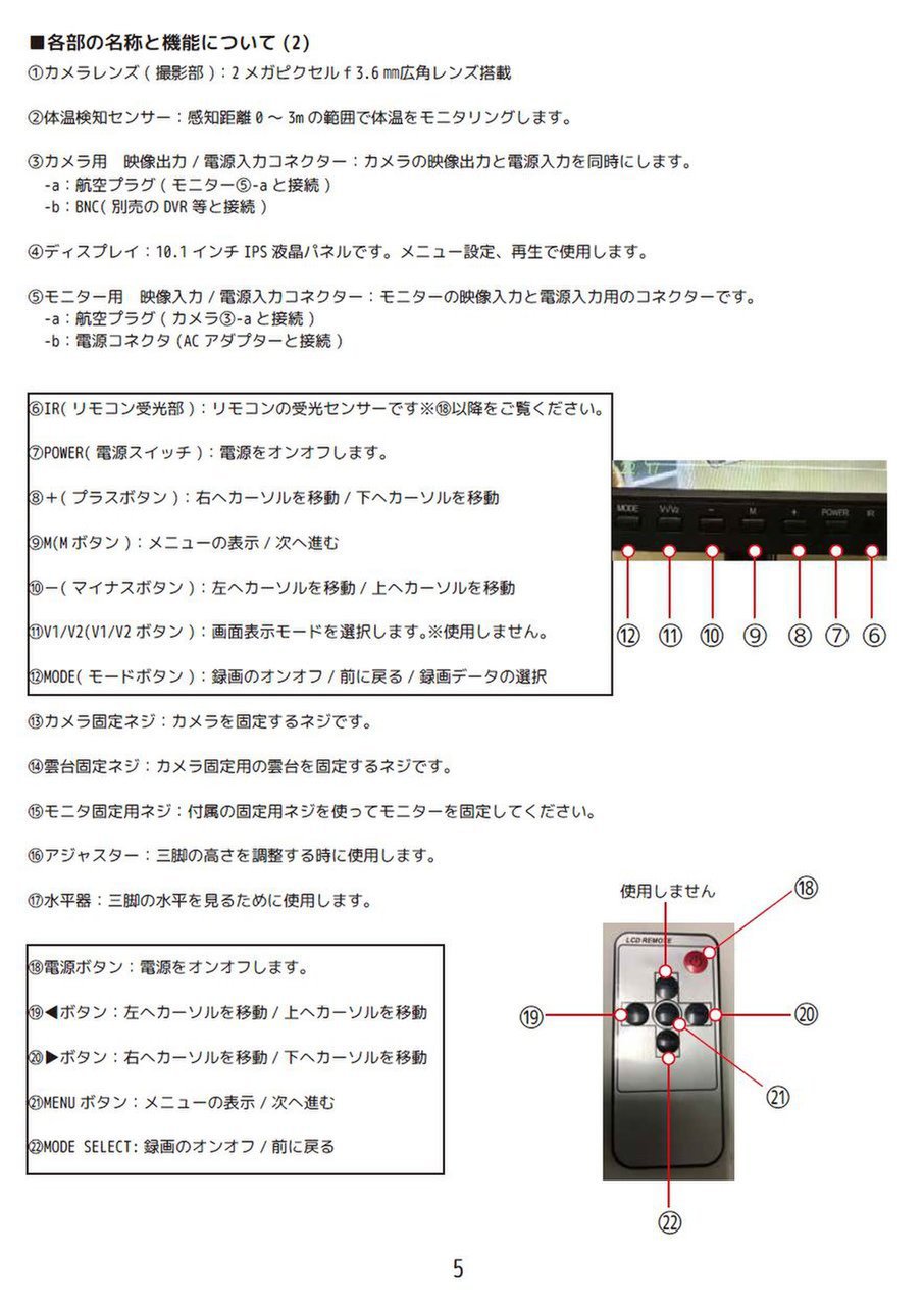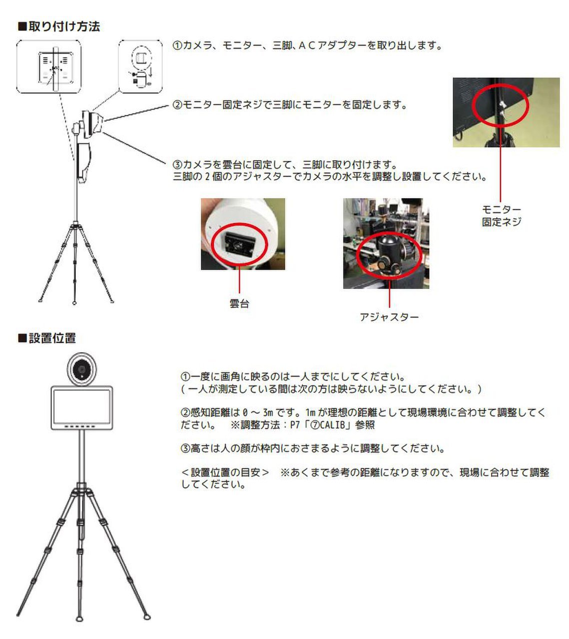 カメラ機器紹介-① NS-P7220TP 200万画 機器の構成 素ドーム カメラ ①200万画素カメラ②10.1インチモニター③三脚 ④ACアダプターの 4点フルセット SDカード (別売) 設置条件 撮影環境の温度に精度が左右されますので 屋内常温の環境でのみ利用できます。 10.1インチ モニター 三脚 設置方法 簡単組み立て、簡単設置で専門的な知識も必要ありません。 付属のACアダプターで電源供給するので100Vコンセントの みご用意ください。