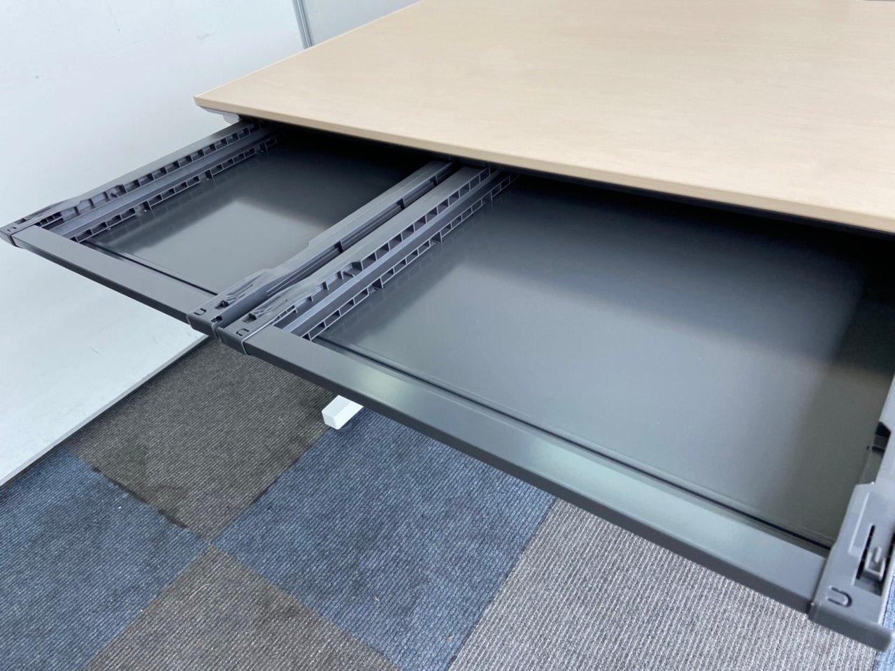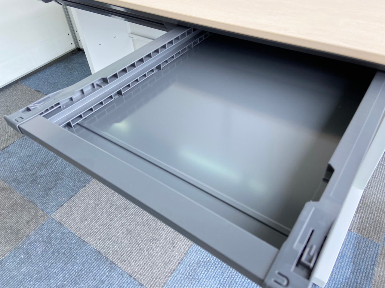 - 地震時、センター引出しが飛び出さないよう、ラッチ機構を装備。脚はデスクの横ズレを軽減させる設計になっています。