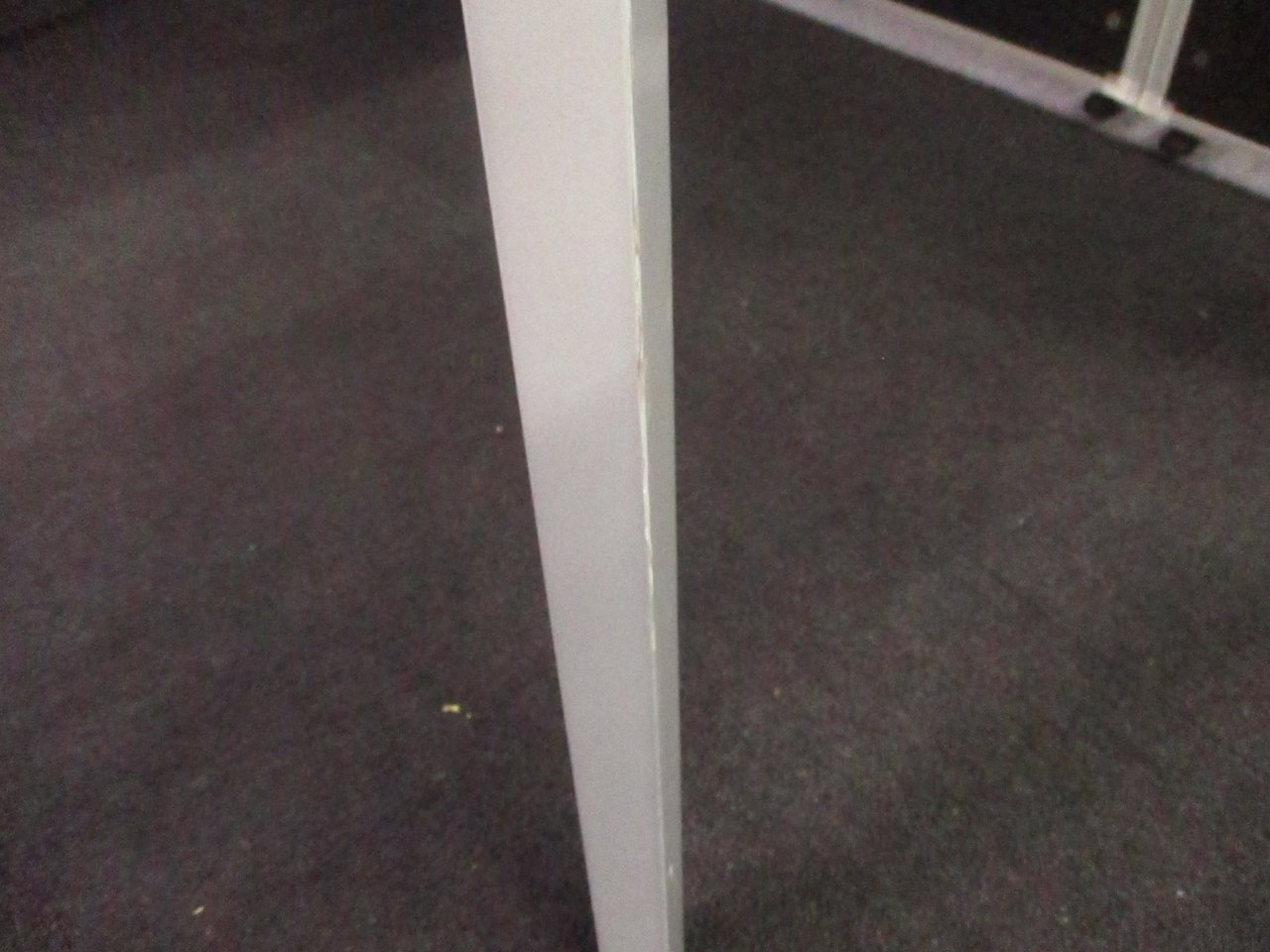 - 一部不具合あり天板歪み、アジャスター無し、キャスター使用不可ようなそのテーブルの本来の効用を果たすための機能以外の一部が使用不可な状態。(例、キャスターロッ ク機能使用不可、棚板無し等がある。)