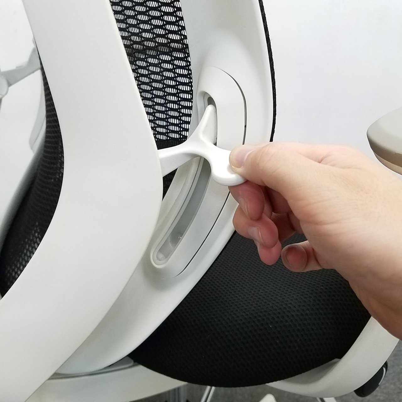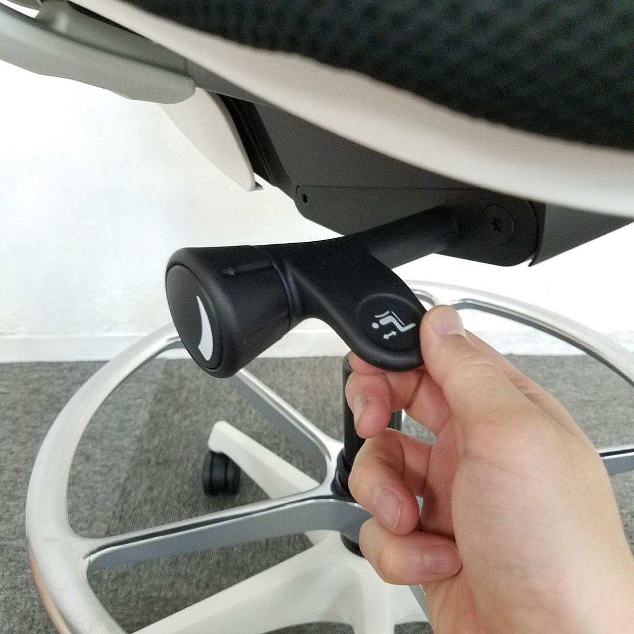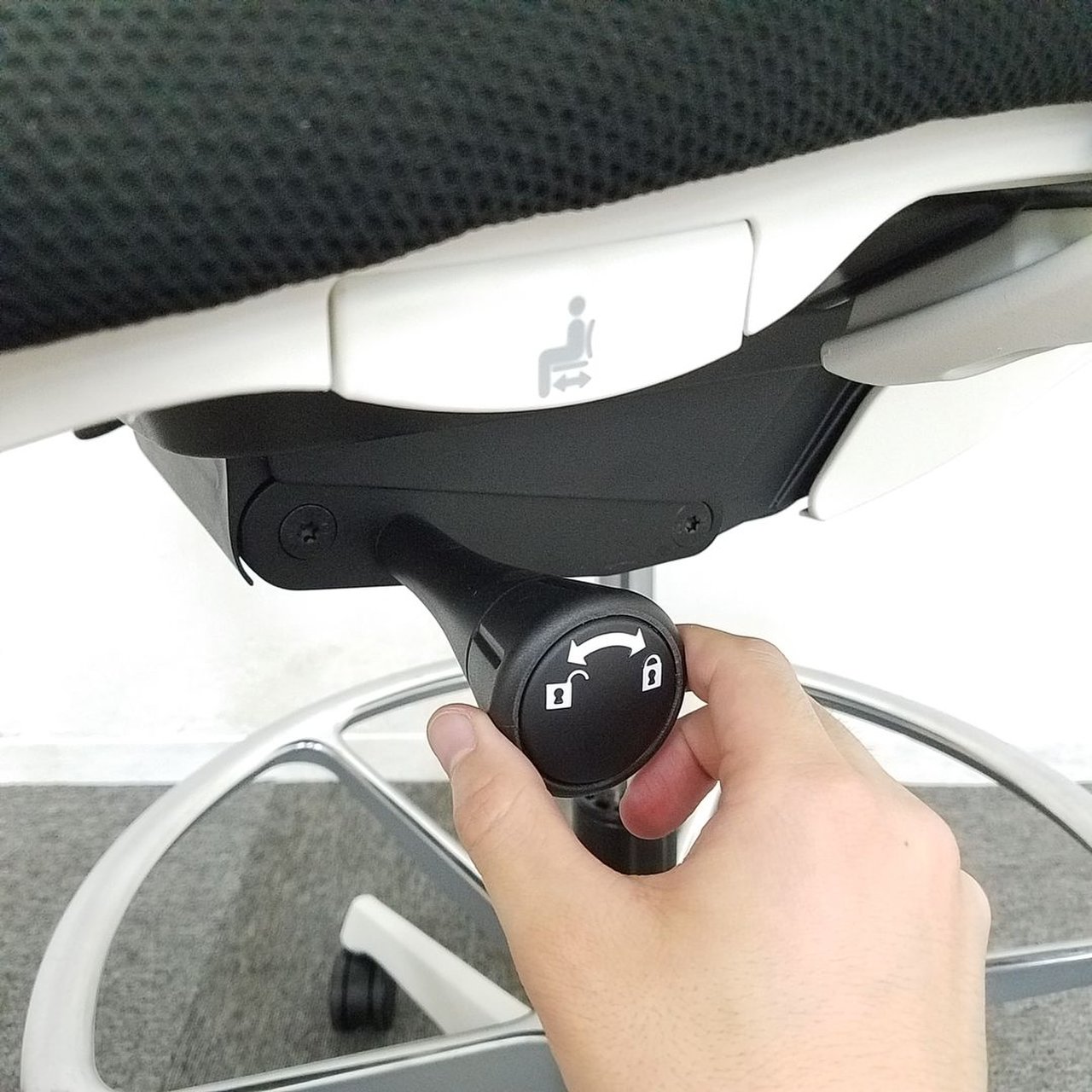 - 座面右下のダイヤル操作で、リクライニングの強弱調整が行えます。これまでのダイヤル式よりも、少ない回転数で、最弱?最強の調整が可能です。