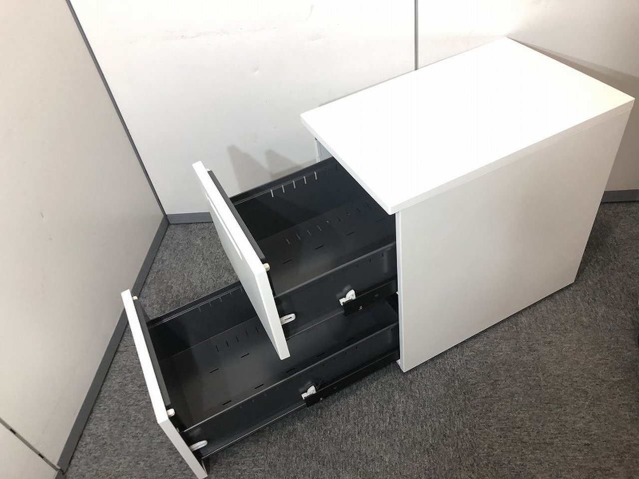 - 一部不具合ありその脇机・ワゴンの本来の効用を果たすための機能以外の一部が使用不可な状態。(例、引出が開閉しづらい、 キャスターロック機能使用不可、ラッチ不良 等がある。)