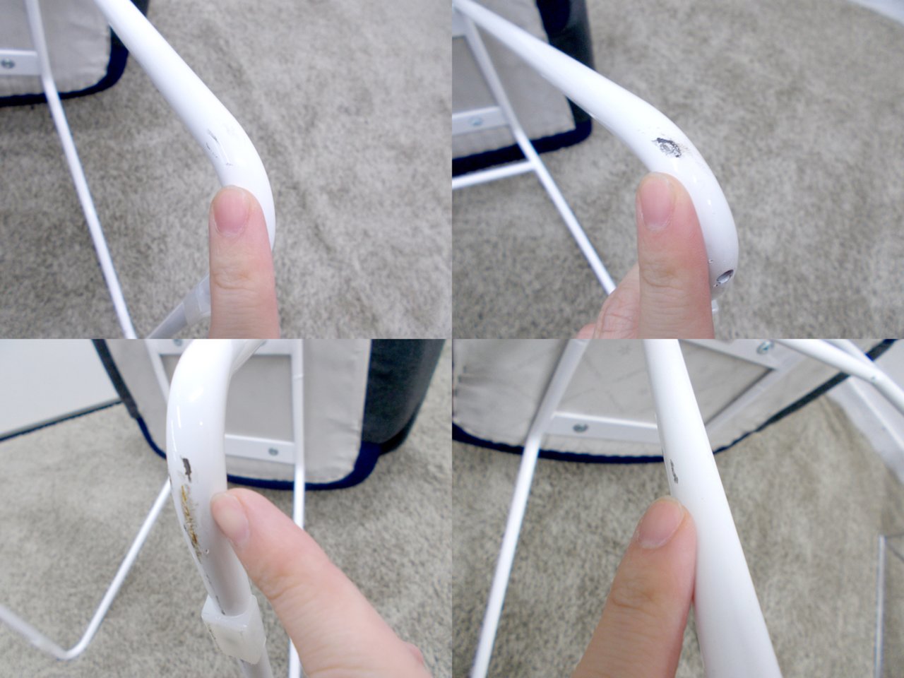 - かなり強い濃い黄ばみ・変色が商品全体にある。(例、座面・背もたれ、脚部等にある。)