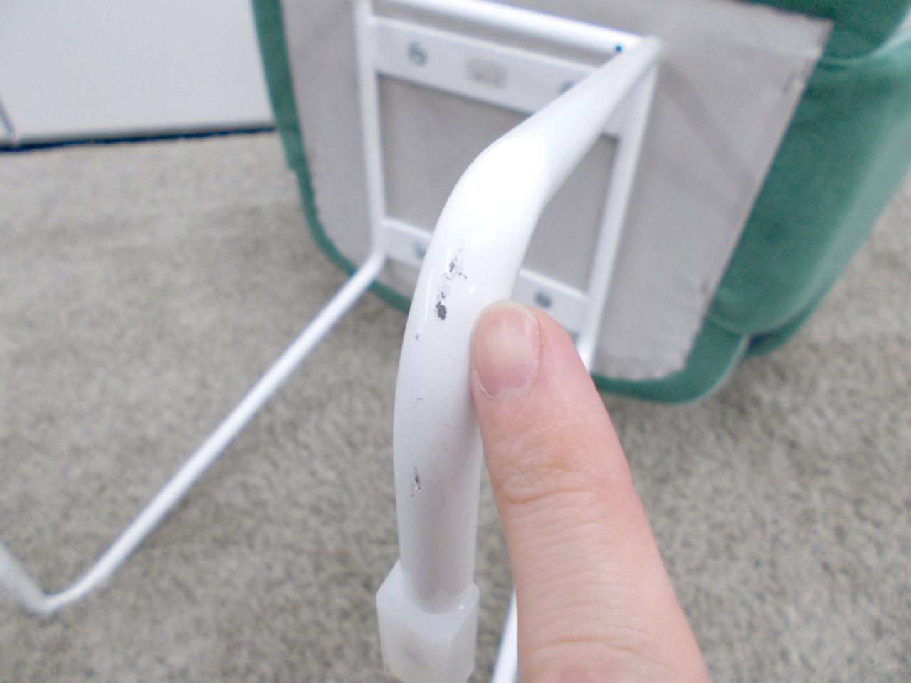 - かなり強い濃い黄ばみ・変色が商品全体にある。(例、座面・背もたれ、脚部等にある。)