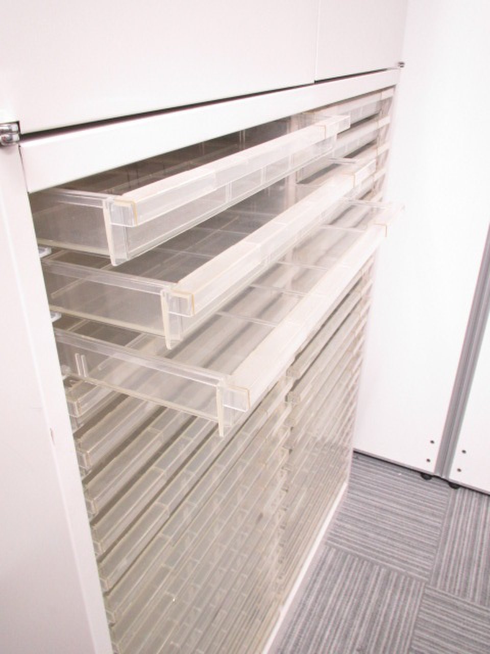 クリスタルトレイは浅型の引き出しが横3列あり
