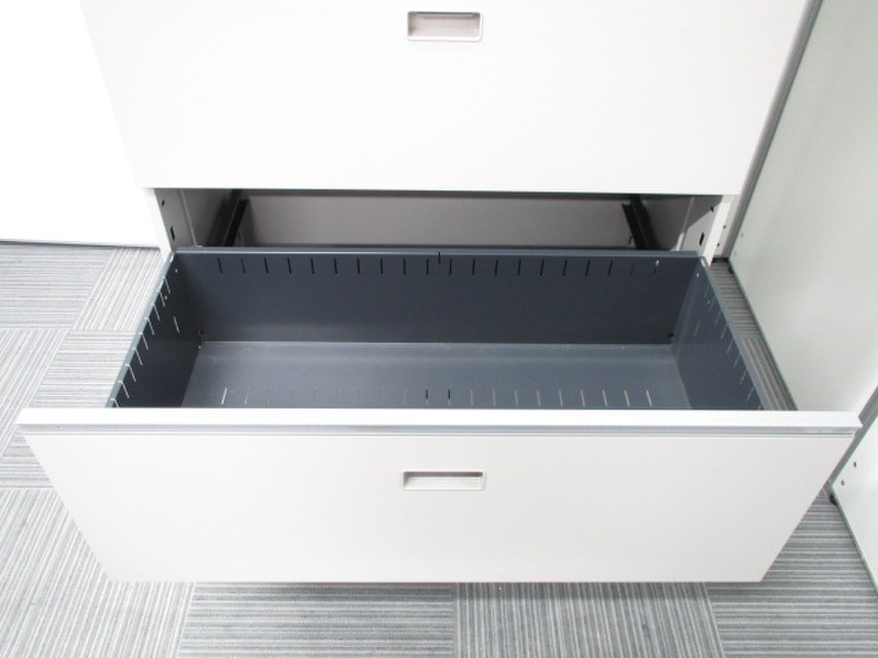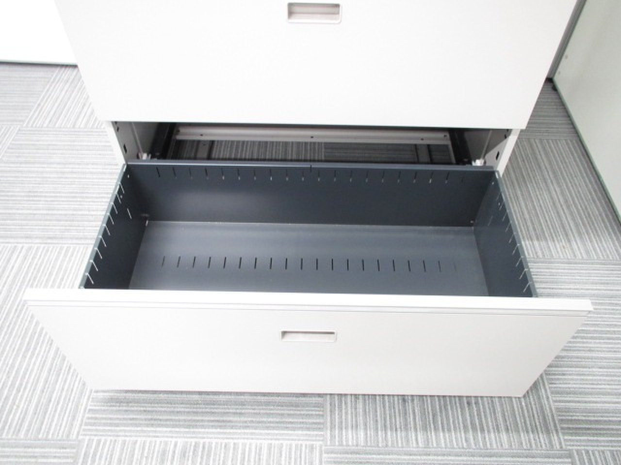 下置きは引き出しタイプになっておりA4ファイル等をすべての段に収納できます