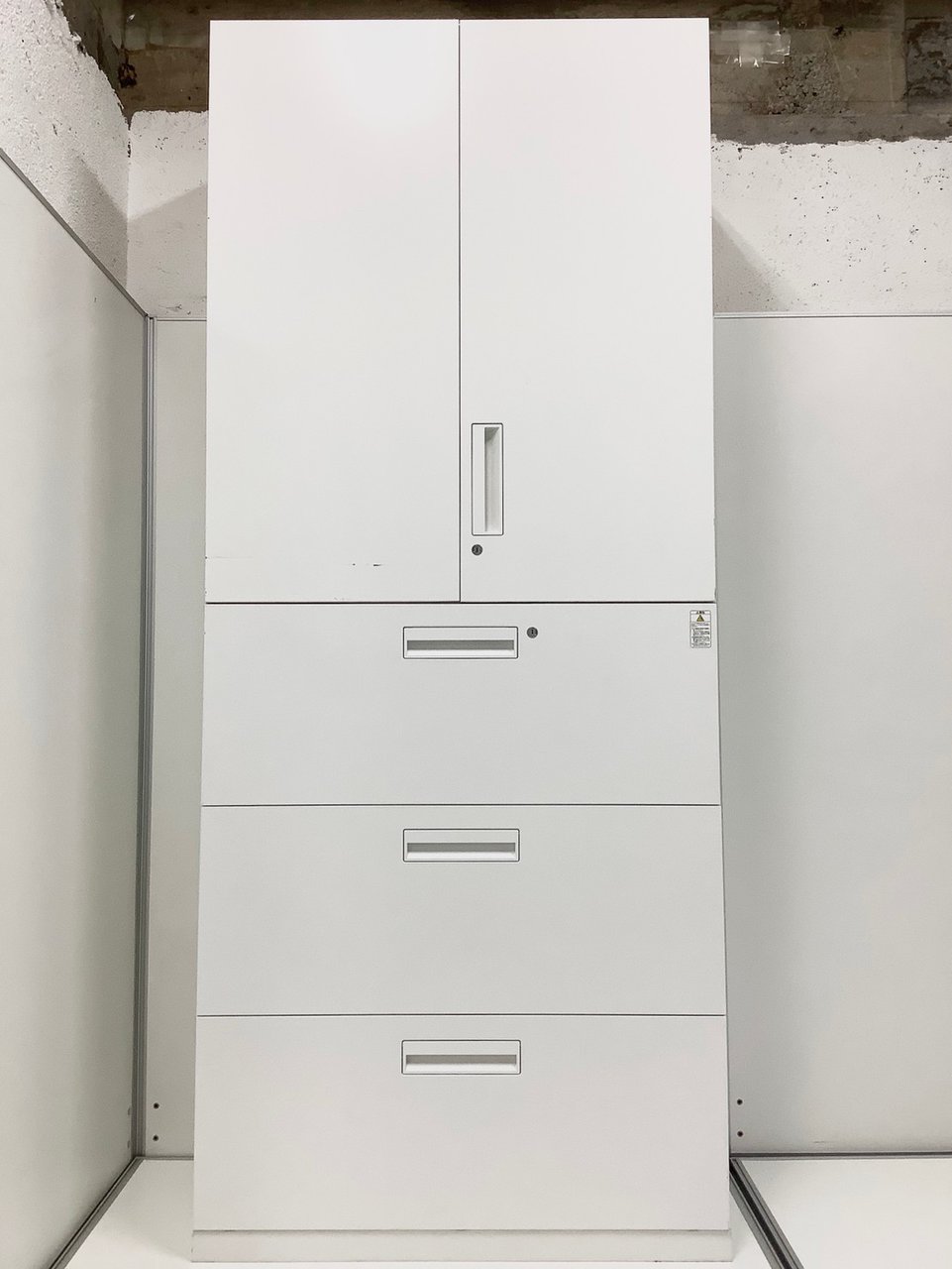 【オフィスの書類をまとめて整理!引き違いと引き出し式の書庫セット!】■コクヨ(KOKUYO)製 エディア(EDIA) 引き違い+3段ラテラル 上下書庫セット 2枚扉 H2150㎜ ■シリンダー錠 ■ホワイト