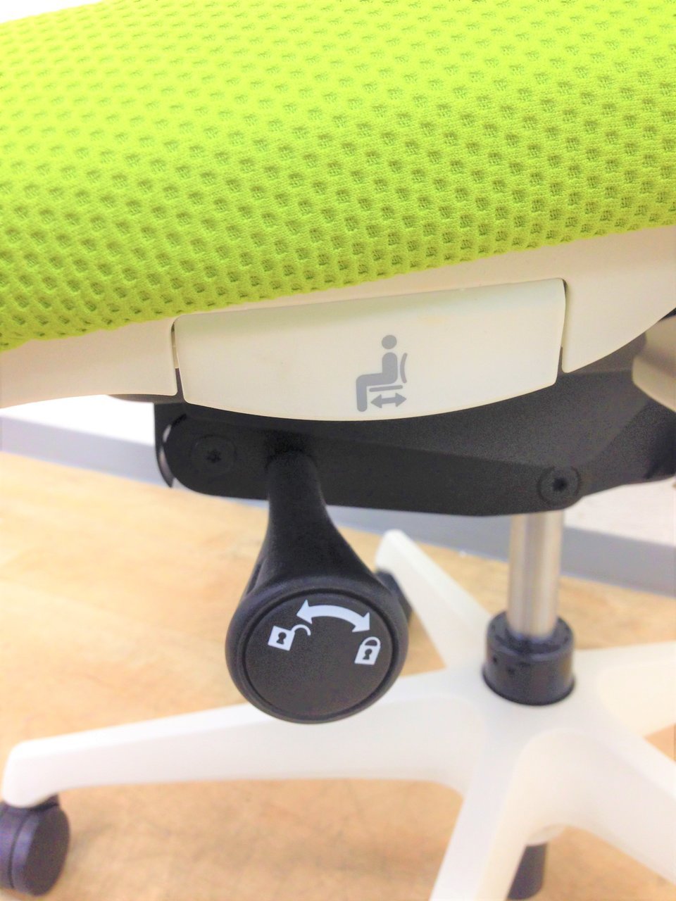 - 座面の左にあるレバー操作により、座面の奥行き調整が可能です。(ストローク:50mm)