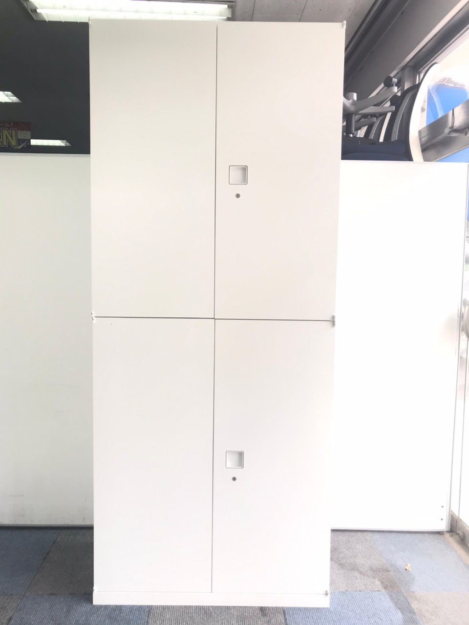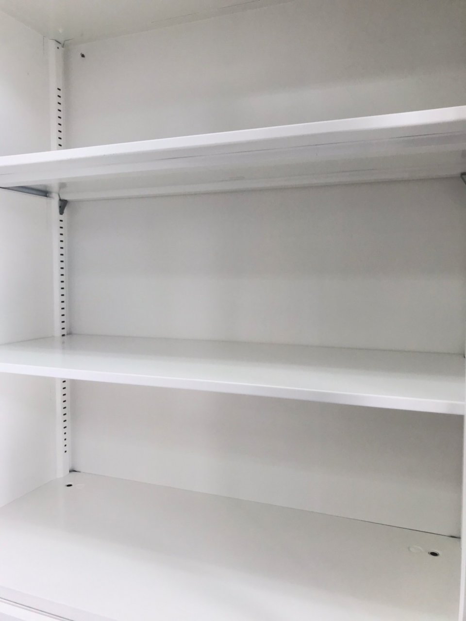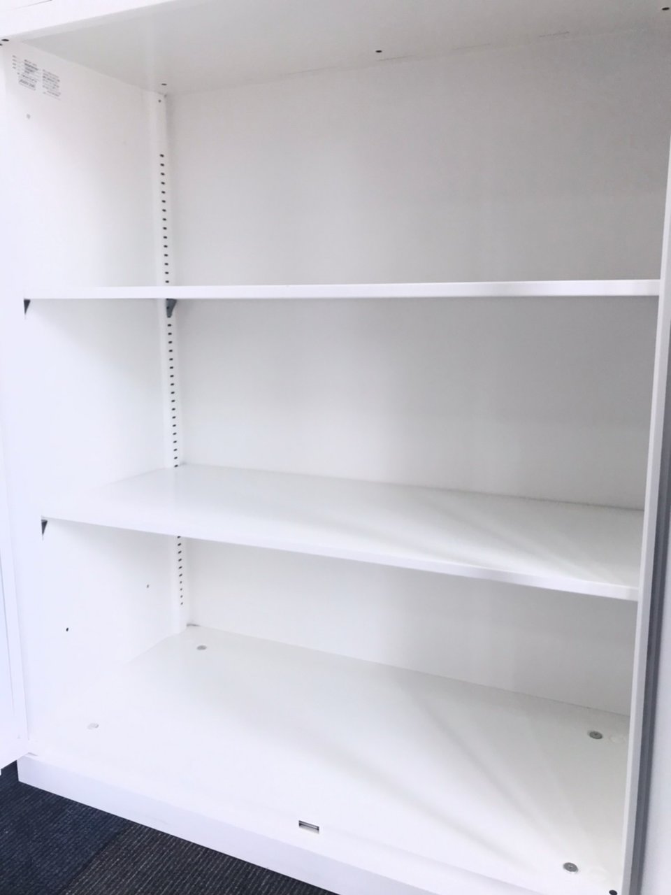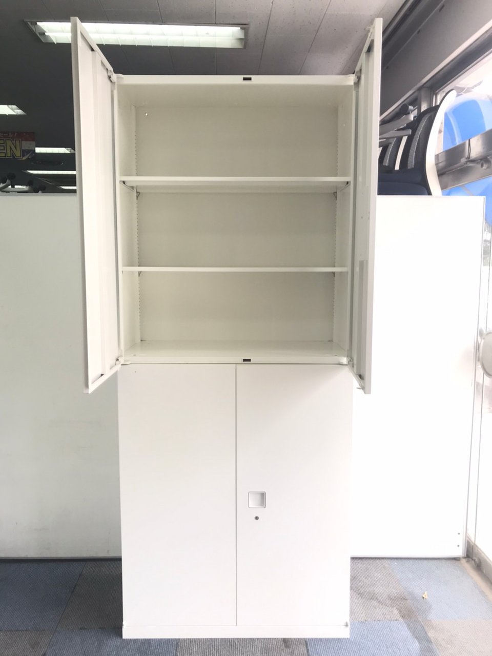 【両開きタイプで一見確認+最上段のみ浅型のクリスタルトレーのコンビ書庫!】■オカムラ製 レクトライン 上下書庫セット(上:両開き 下:クリスタルトレー)ホワイト 《オフィスバスターズ福岡博多店は、福岡を拠点として、日本全国へ中古オフィス用品・オフィス家具を提供しております》