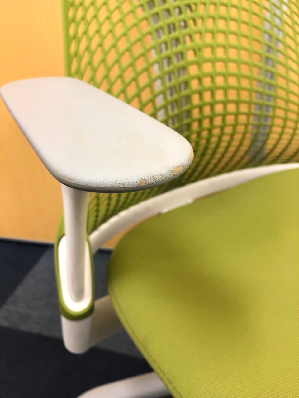 - あり黄ばみ・変色が広い範囲にうっすらある、または濃い黄ばみ・変色が一部ある。(例、座面・背もたれ、脚部等にある。)