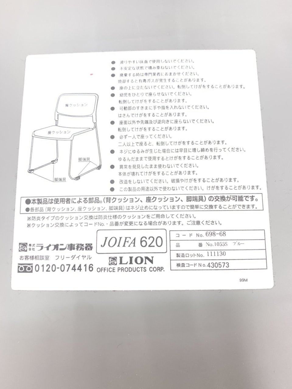 【汚れ落としやすいビニール製】丈夫な国内メーカー製スタッキングチェア!重ね置きでスペースを有効に!ライオン製- 埼玉本店