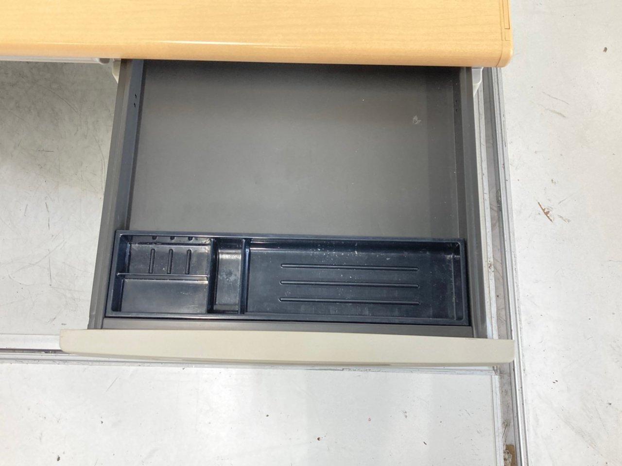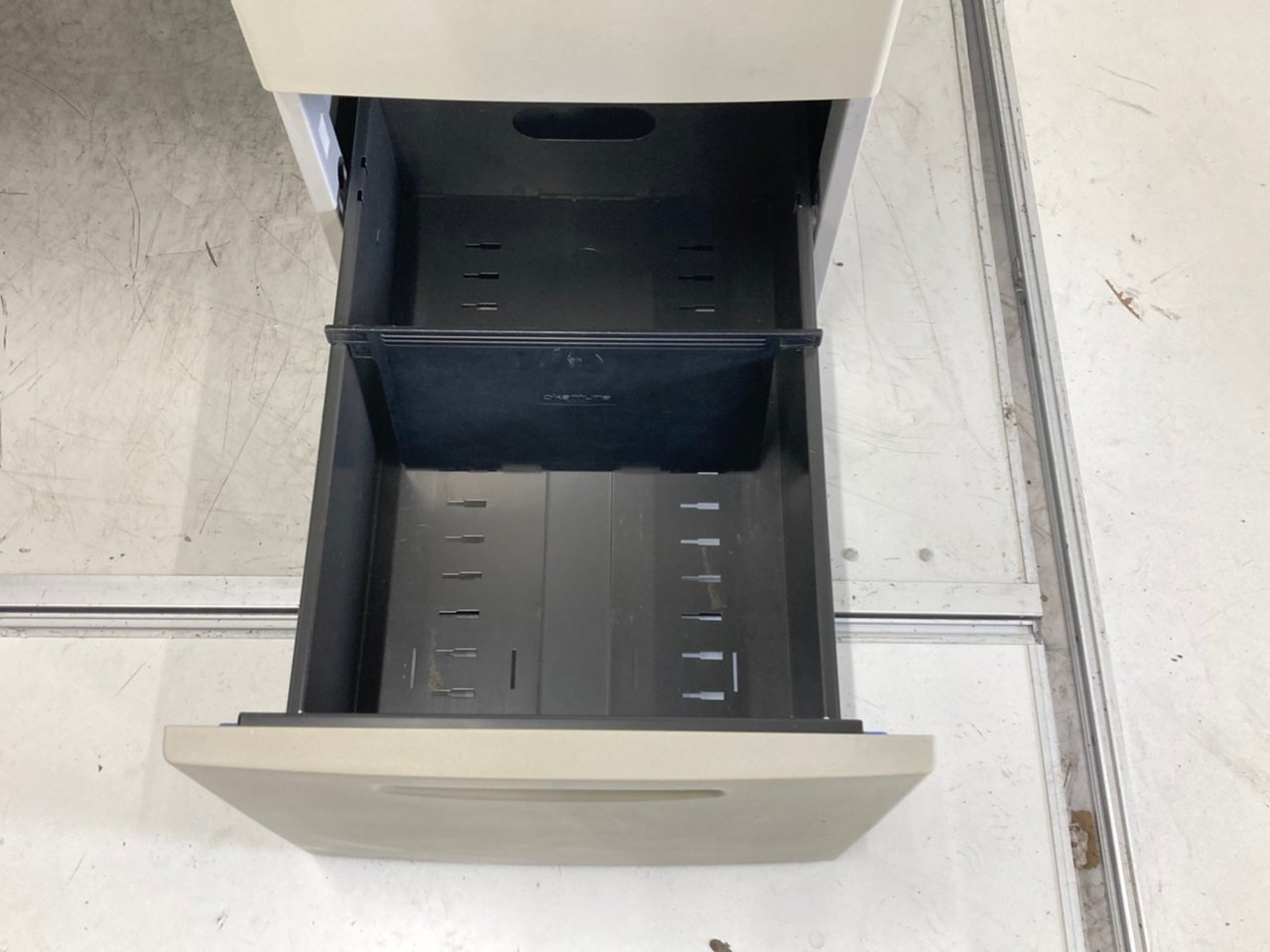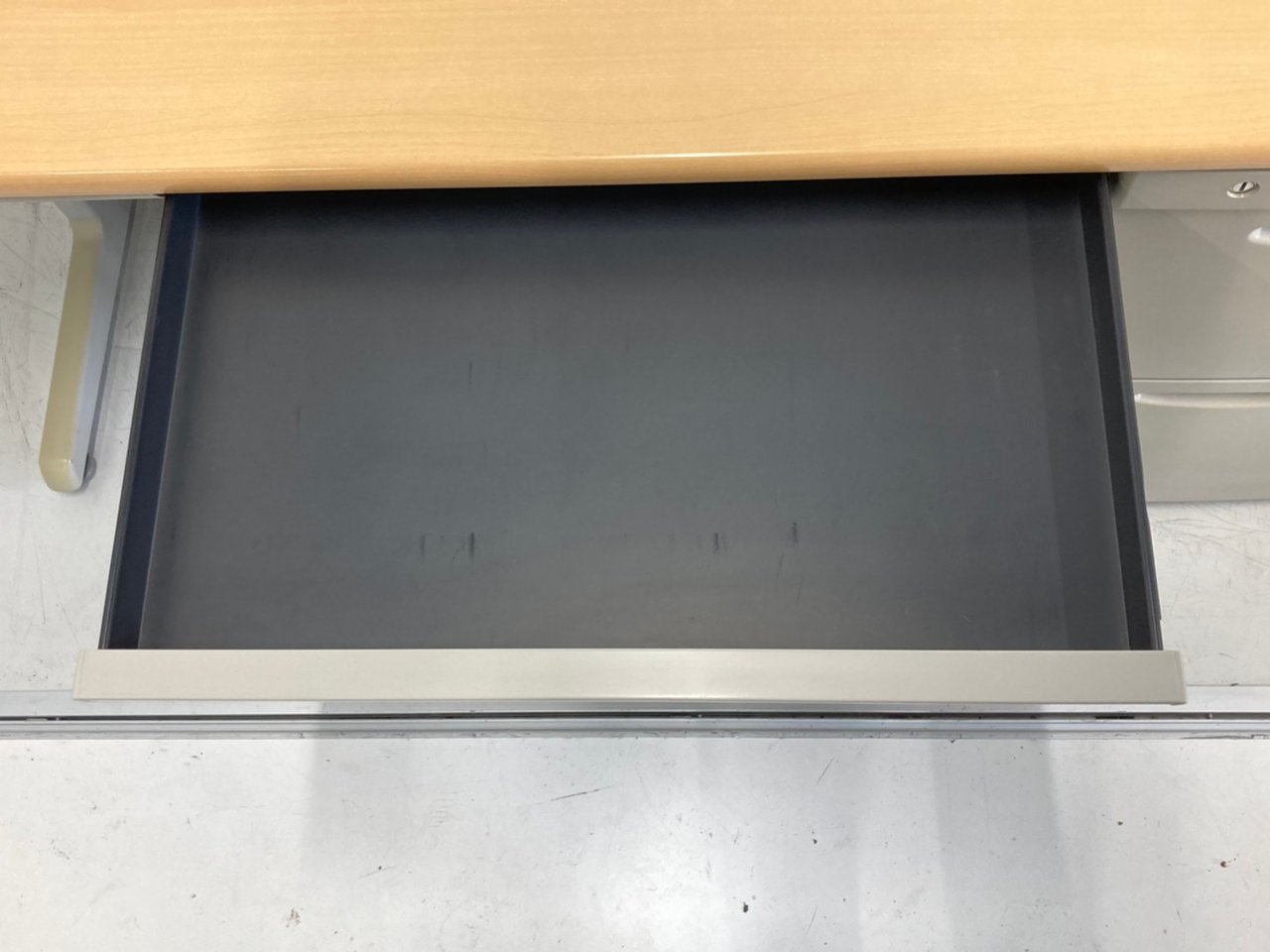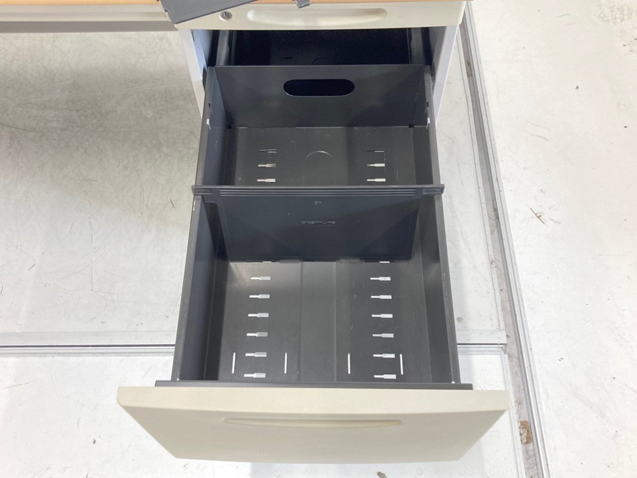 - 袖机のワゴンは、最下段がロング引出しになっており、従来より収納力120%アップ。
