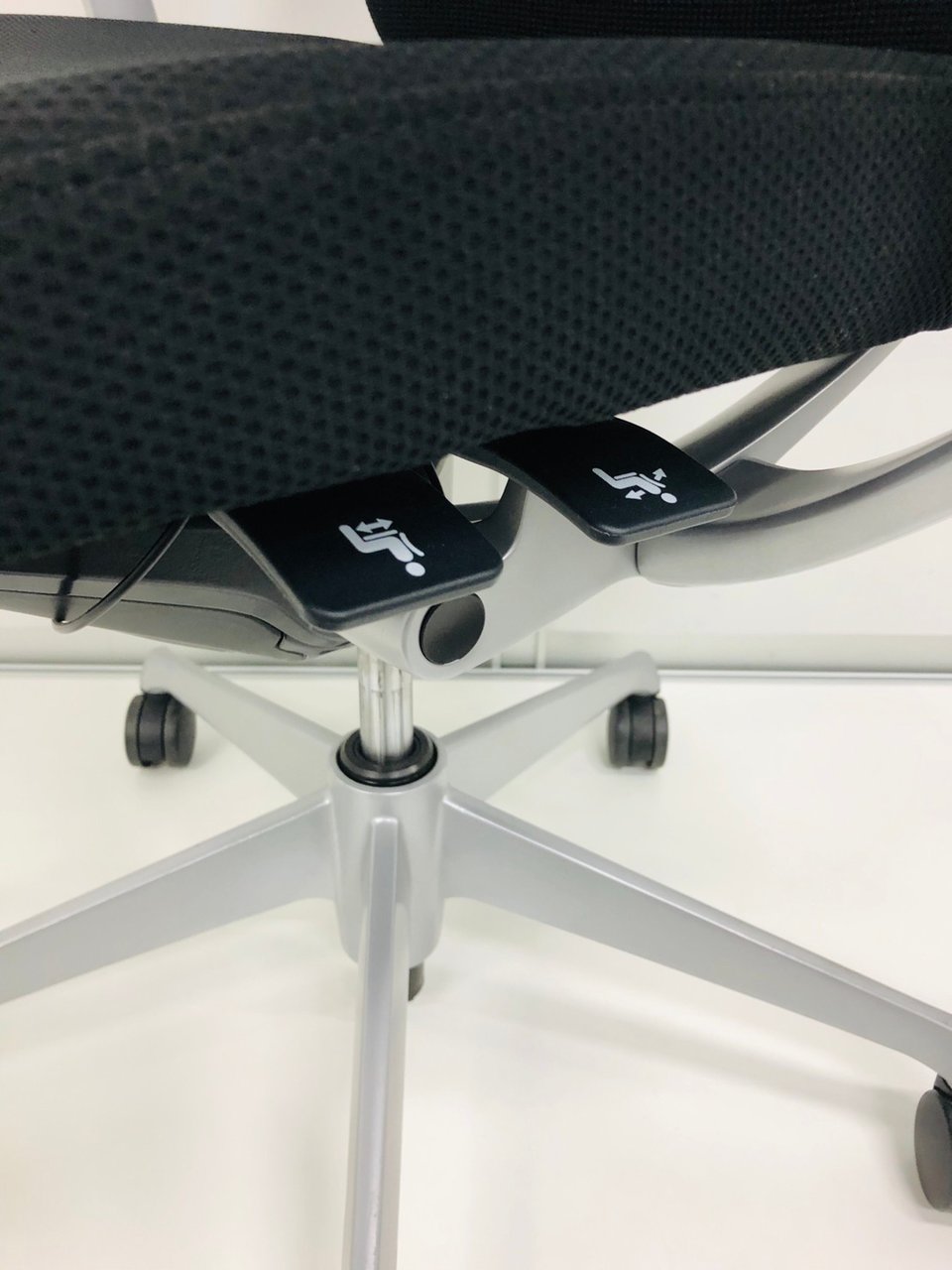 座面の高さや前後などの基本的な調整レバーが座面裏の前方に集約されており、姿勢を変えずに調節ができます。