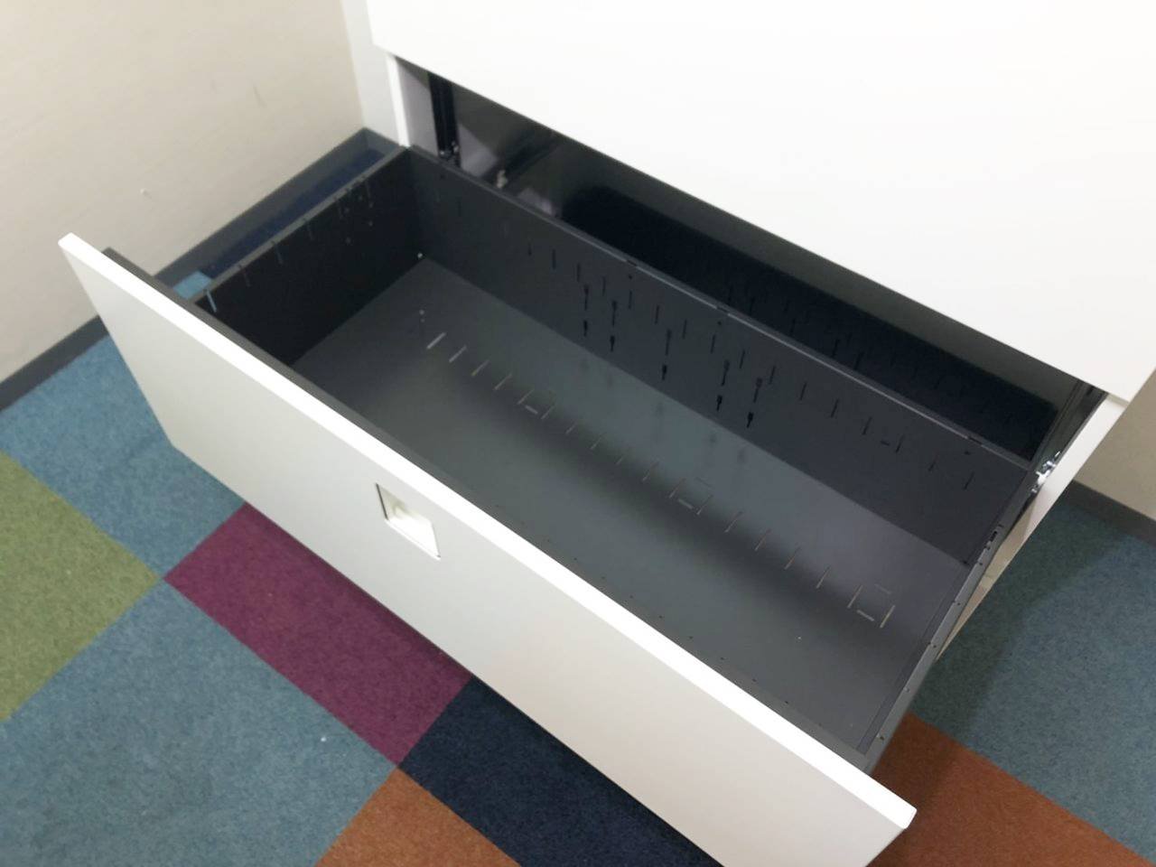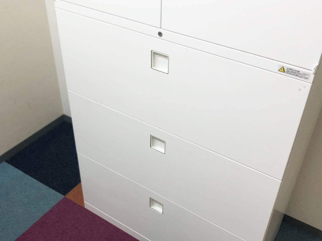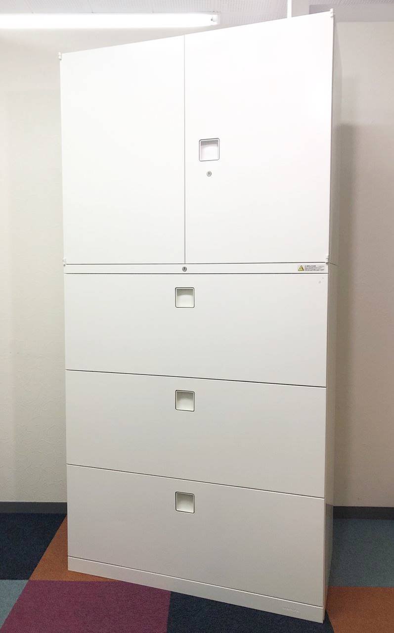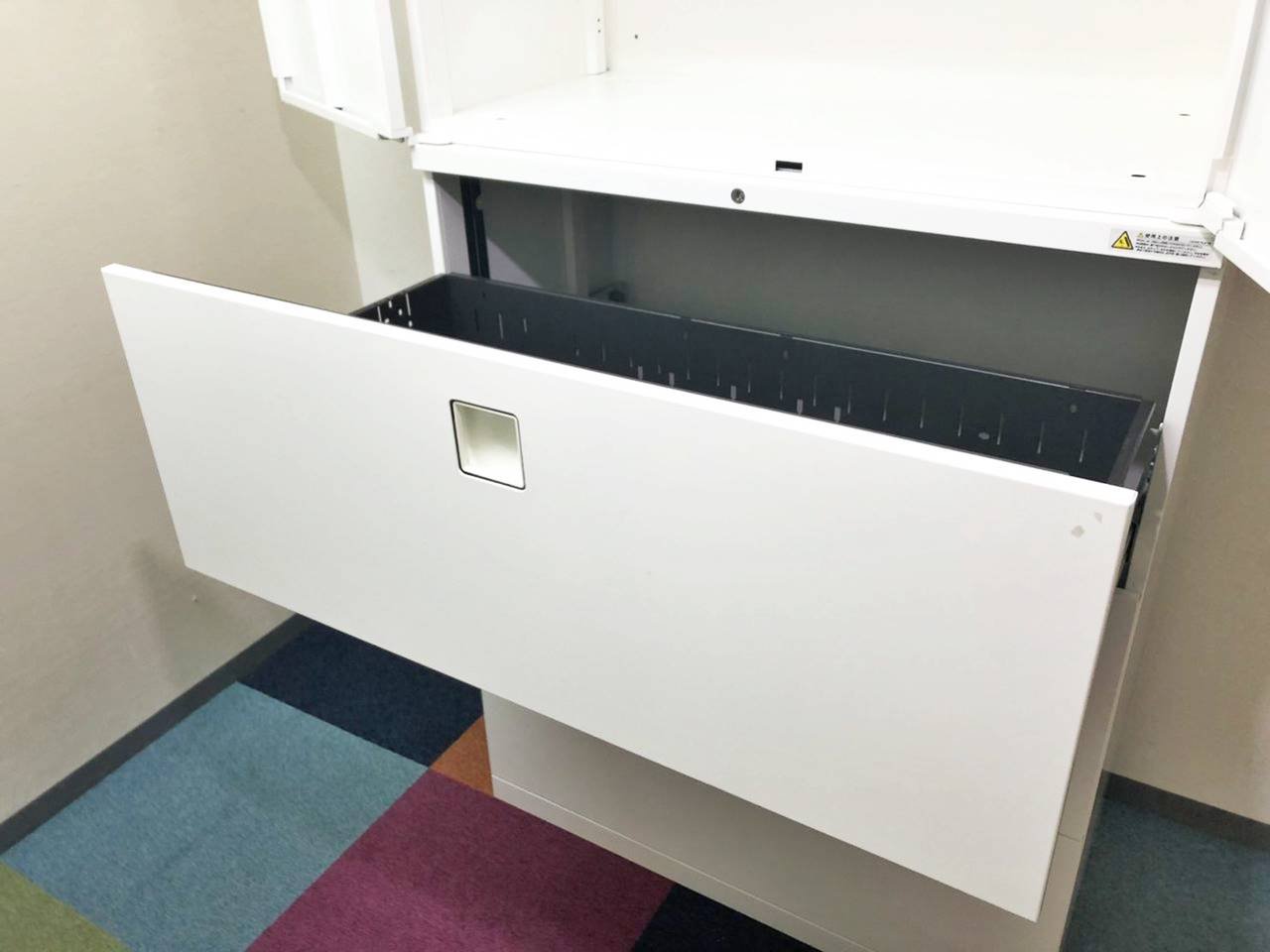 スライド式の扉+引き出しタイプの便利な書庫セットが入荷!使い勝手抜群のハイキャビネットが入荷! ■オカムラ/レクトライン/ホワイト 2枚引き戸+3段ラテラルキャビネット