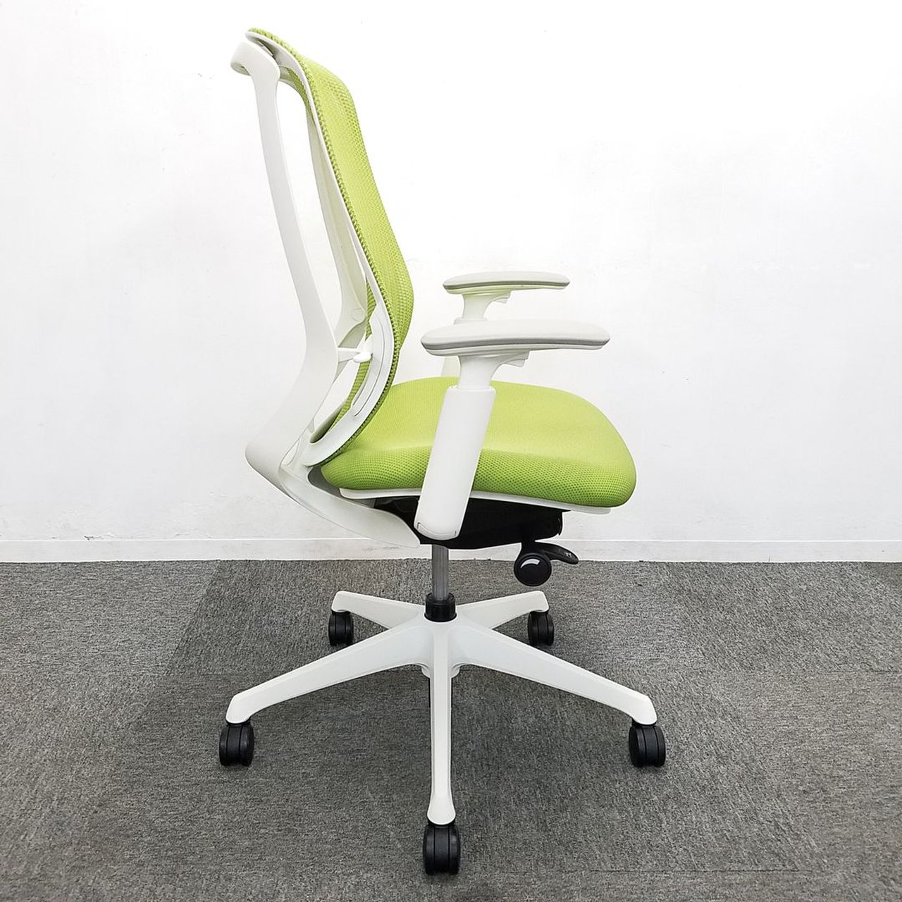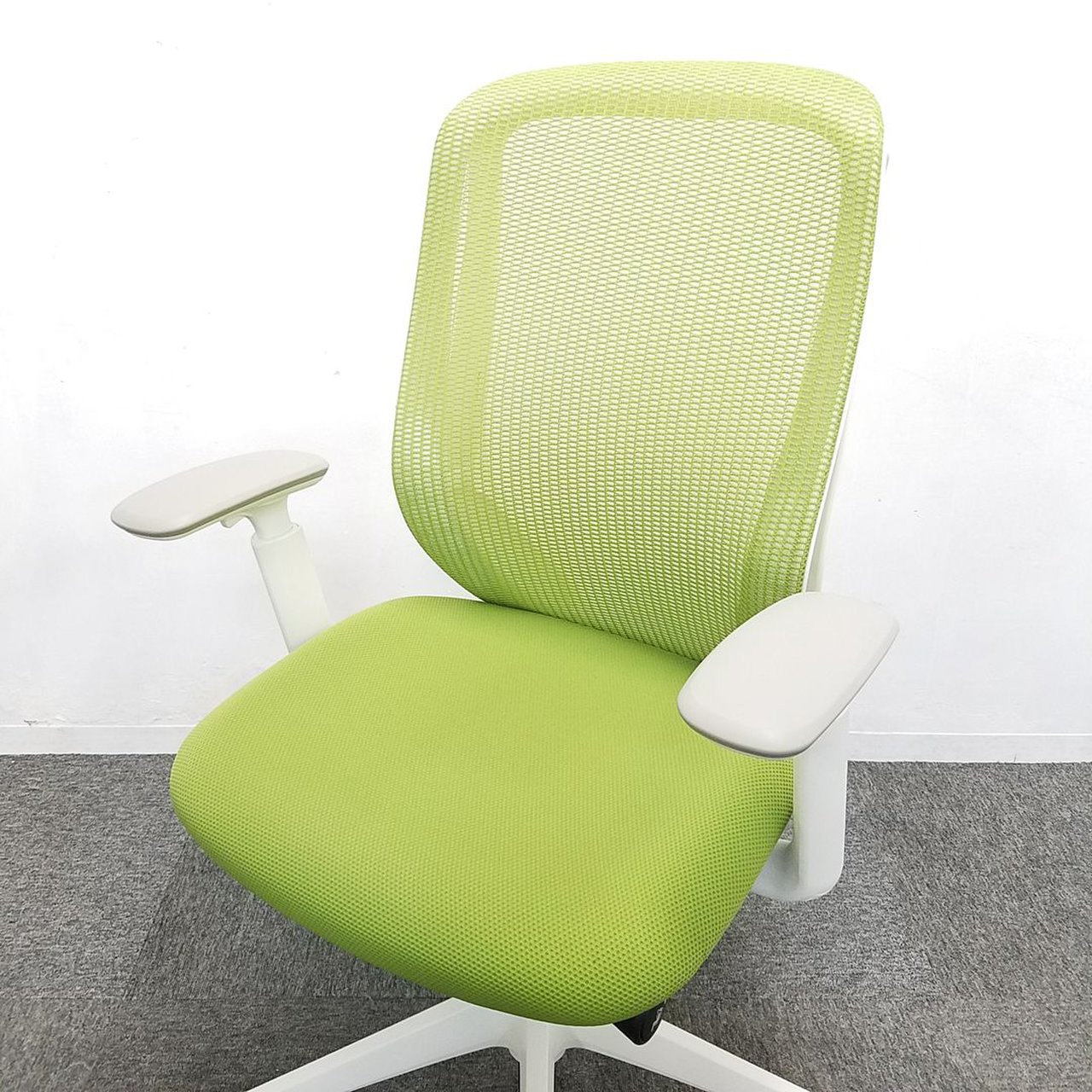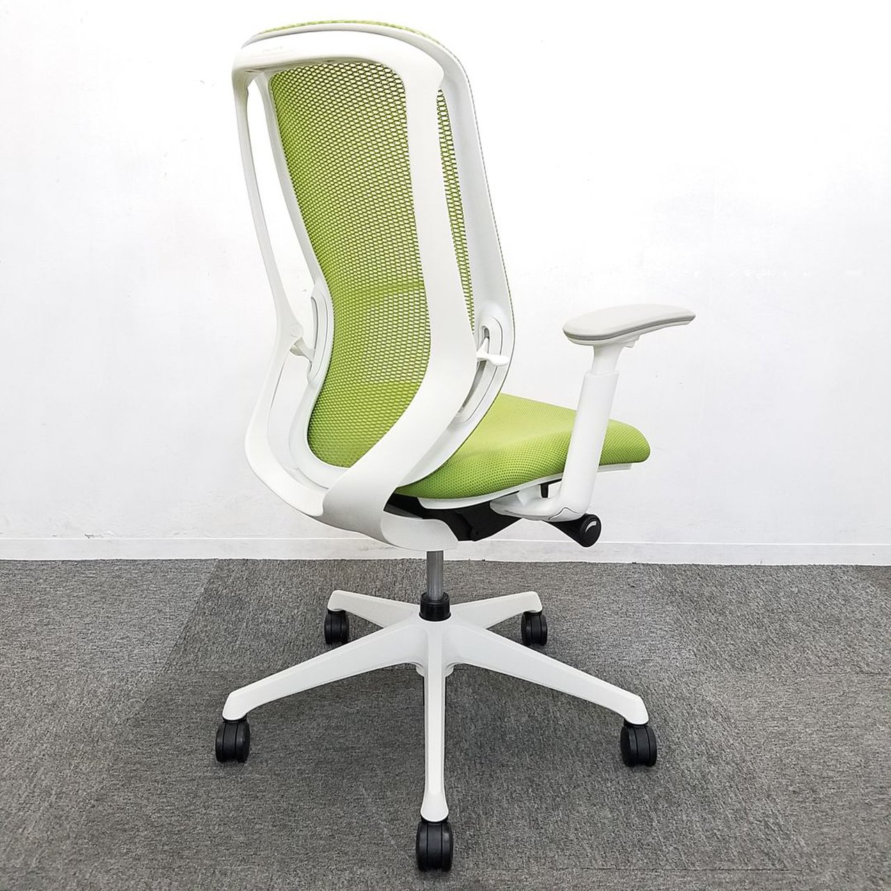 【在庫入替セール品】【人気のシルフィチェアヘッドレスト付きが1脚限定入荷!】オカムラ シルフィ ライムグリーン エクストラハイバック ホワイトフレーム デザインアーム(固定肘) 前傾チルト機能付き