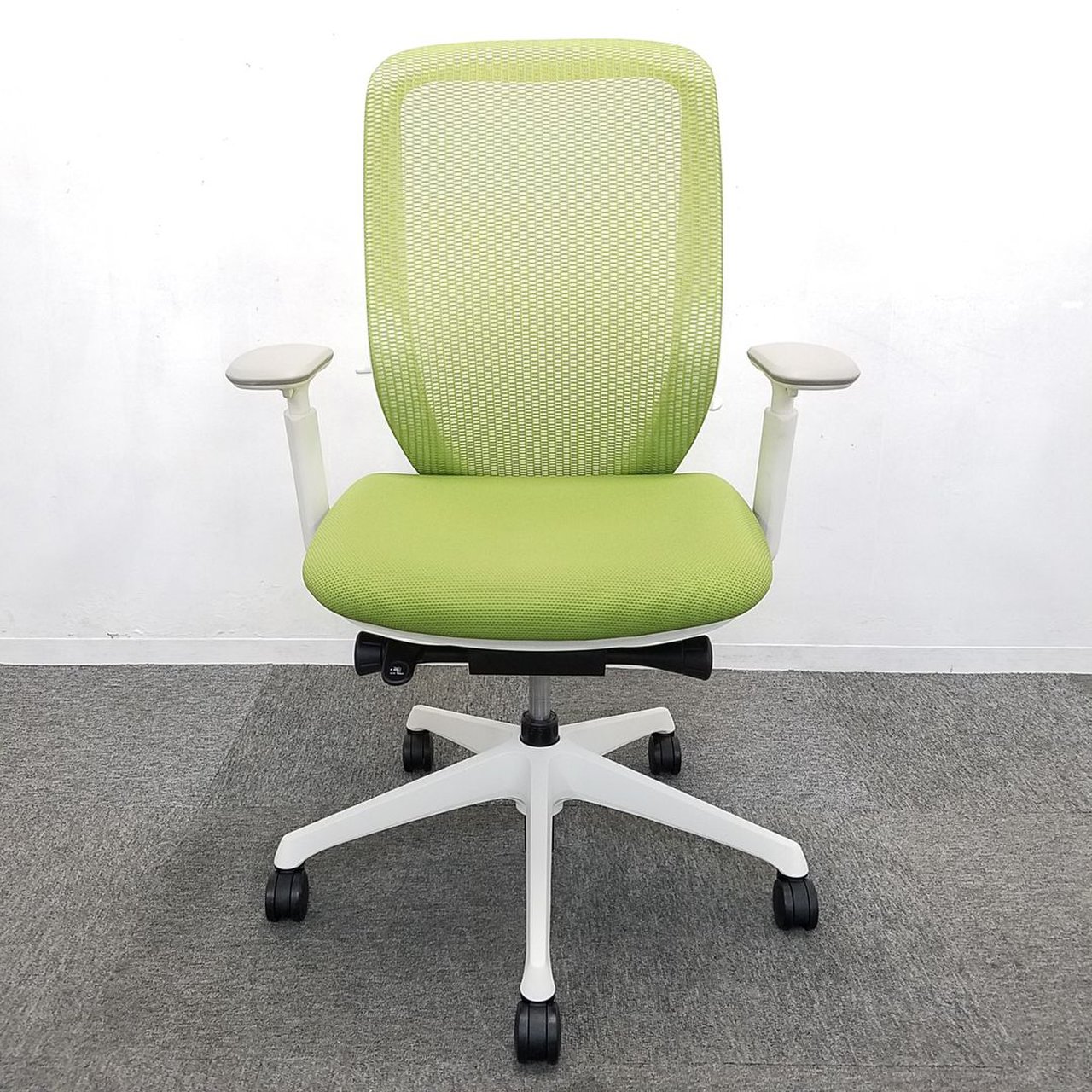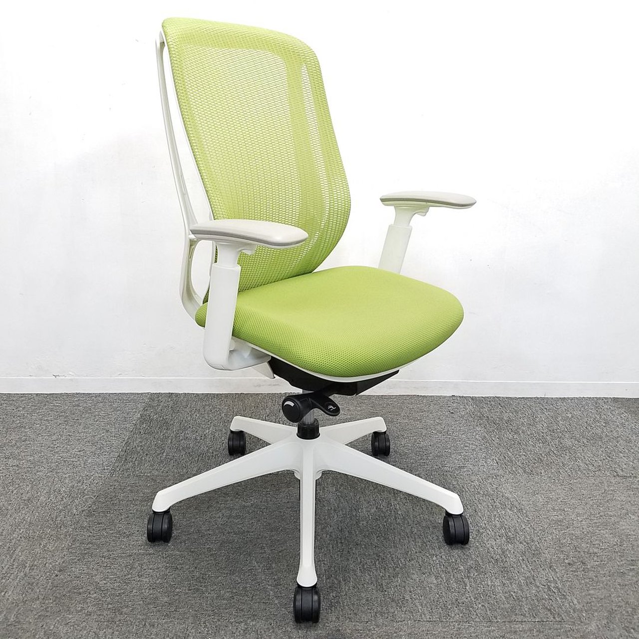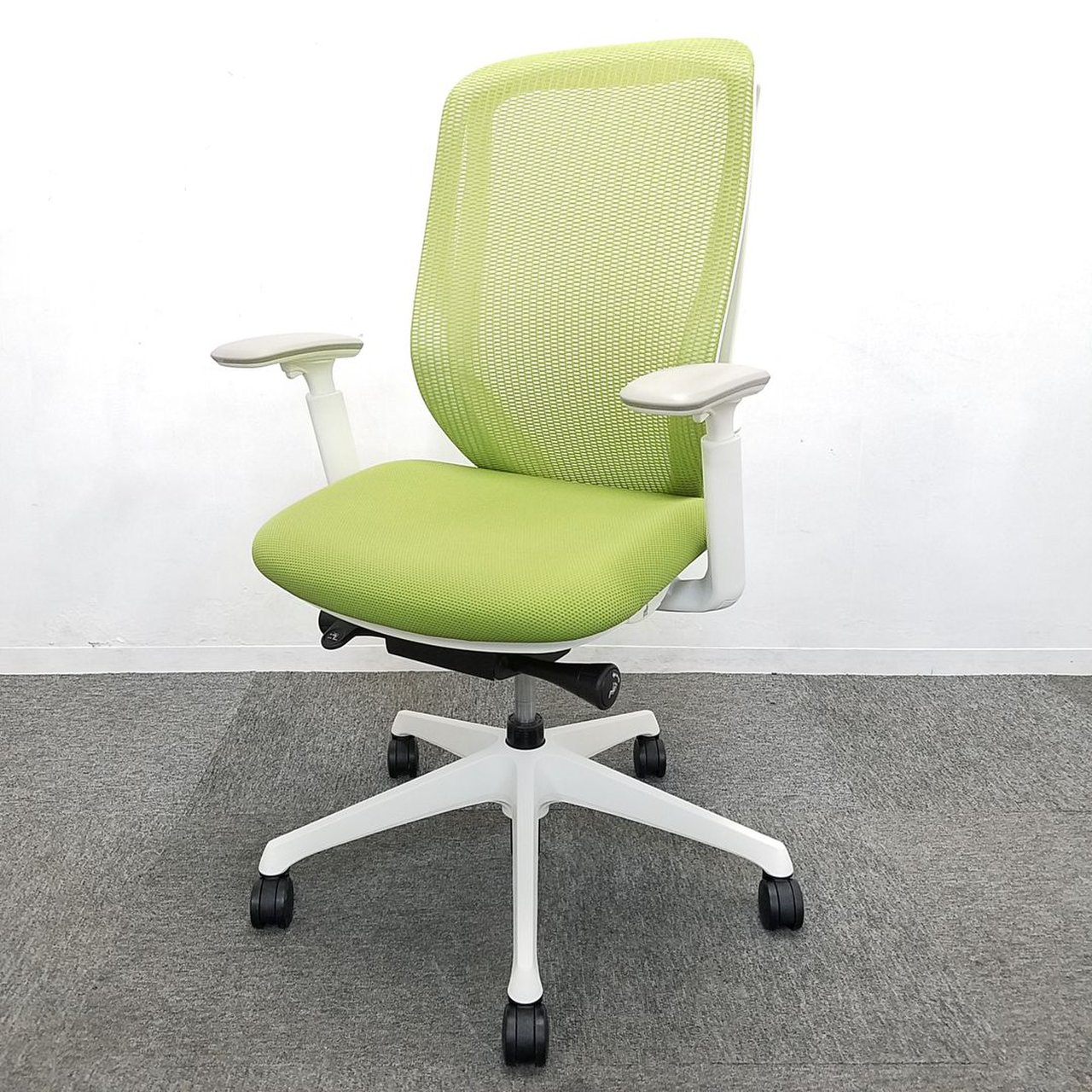 【在庫入替セール品】【人気のシルフィチェアヘッドレスト付きが1脚限定入荷!】オカムラ シルフィ ライムグリーン エクストラハイバック ホワイトフレーム デザインアーム(固定肘) 前傾チルト機能付き