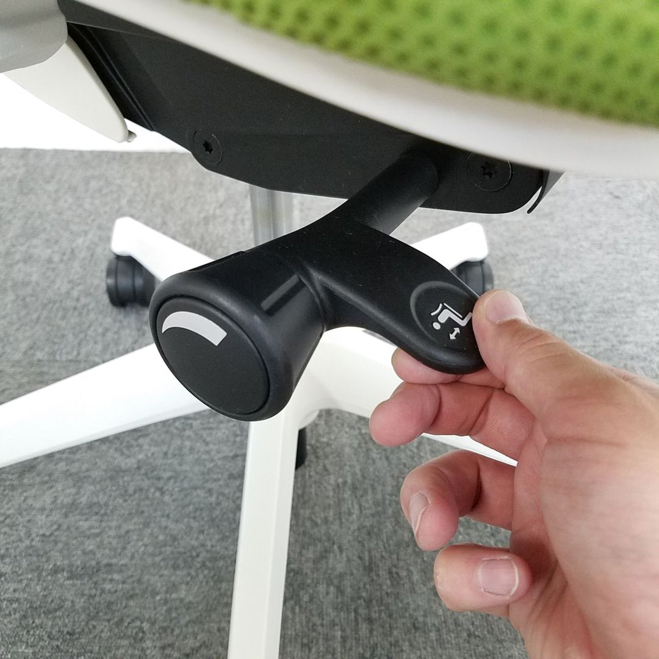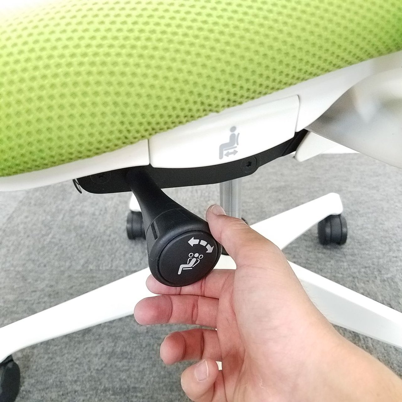 - 座面右下のダイヤル操作で、リクライニングの強弱調整が行えます。これまでのダイヤル式よりも、少ない回転数で、最弱?最強の調整が可能です。