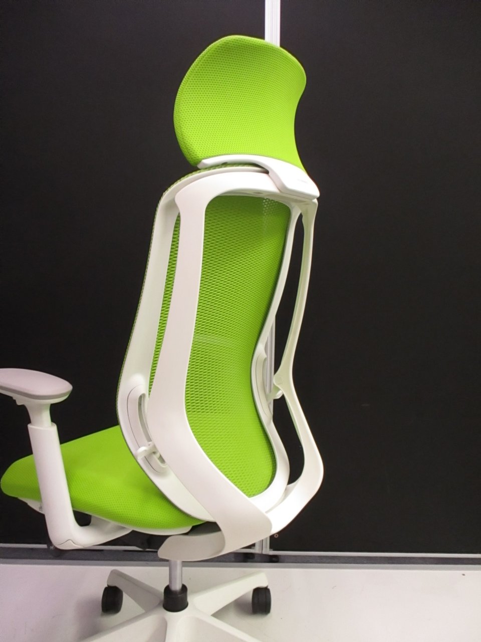 【レア商品入荷!人気のワークヴェール付!集中作業にもオススメ!】■オカムラ シルフィーチェア 可動肘付 ライムグリーン ヘッドレスト付 エクストラハイバック ■背のカーブを変えられる!新感覚のオフィスシーティング!【Okamrua Sylphy】★