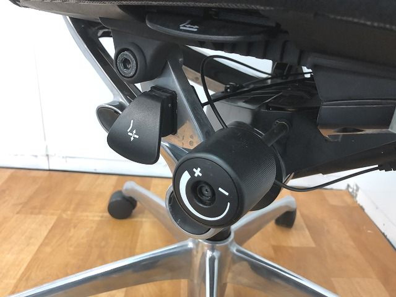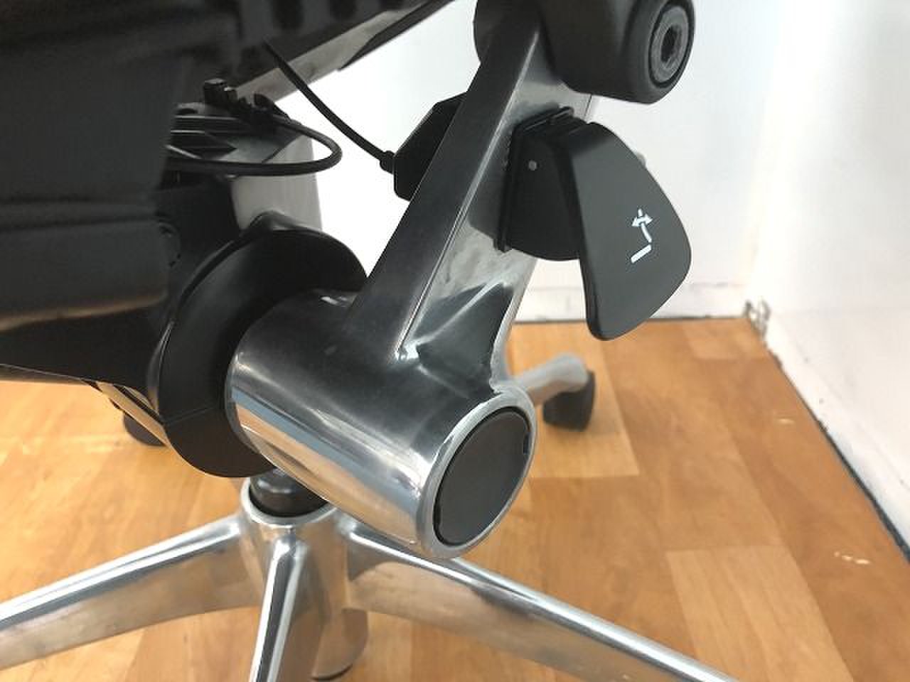 - 身体にフィットする自然な動きを実現するアンクルチルト®リクライニング。座面左下のレバーでお好みの角度に固定できます。 リクライニングの強弱は無段階で調整可能です。