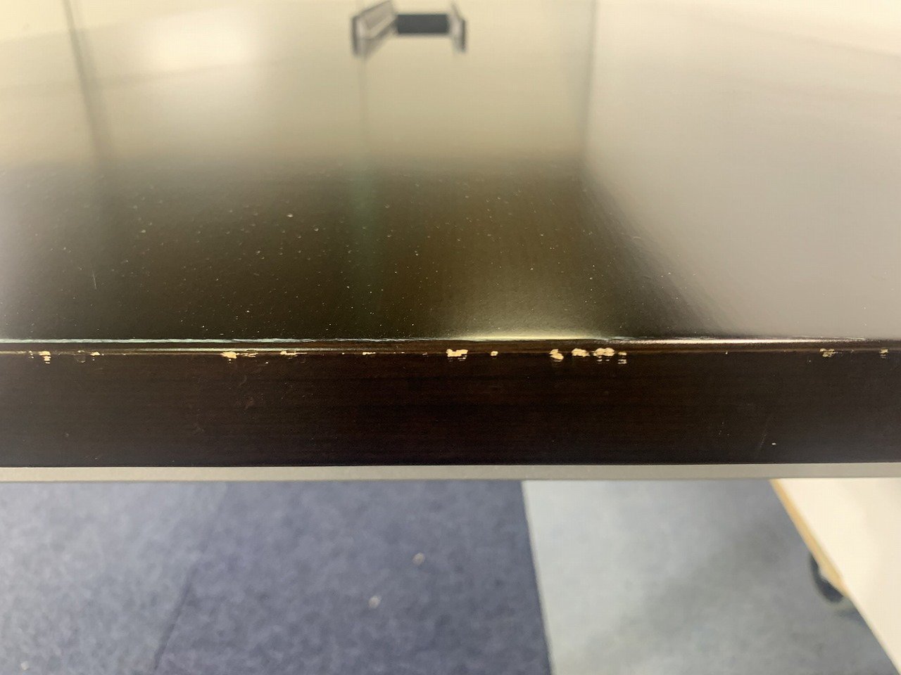 - かなり強い濃い黄ばみ・変色が商品全体にある。(例、天板、幕板、棚板、サイド部分、脚部等にある。)
