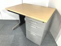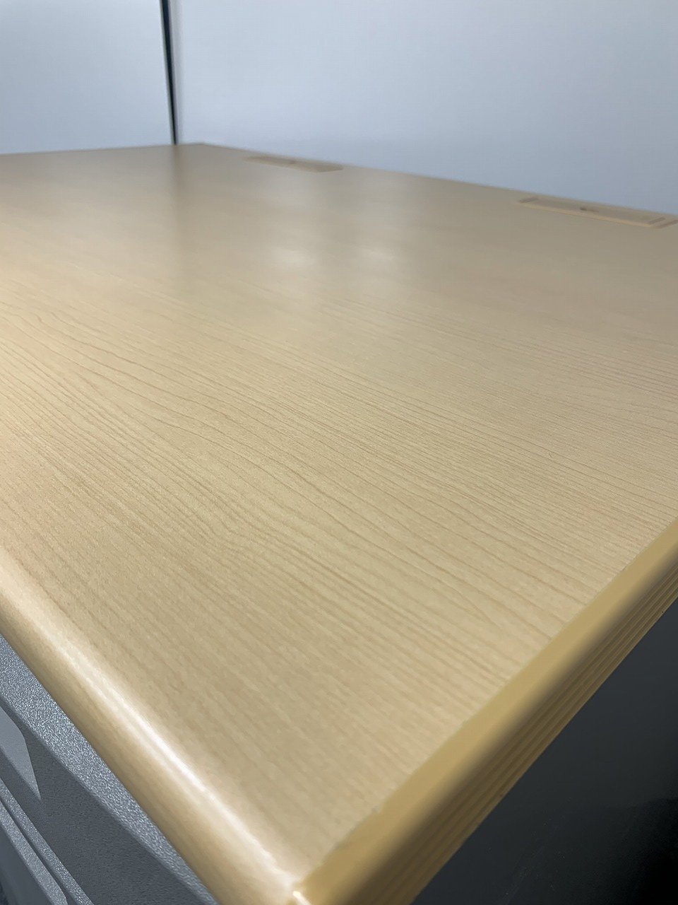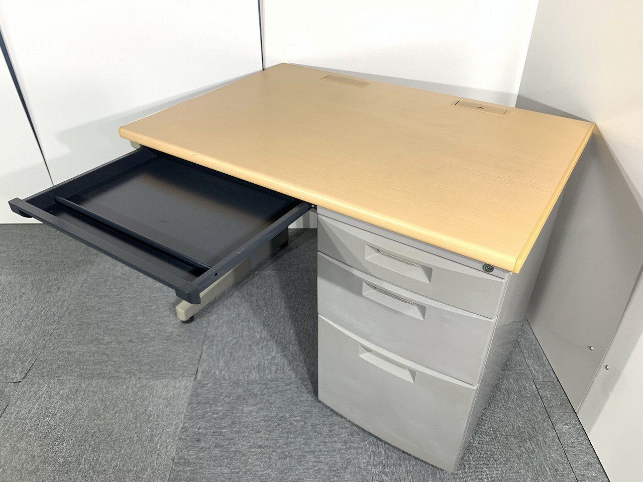 天板がナチュラルカラー、本体はグレー系の片袖デスクです。
