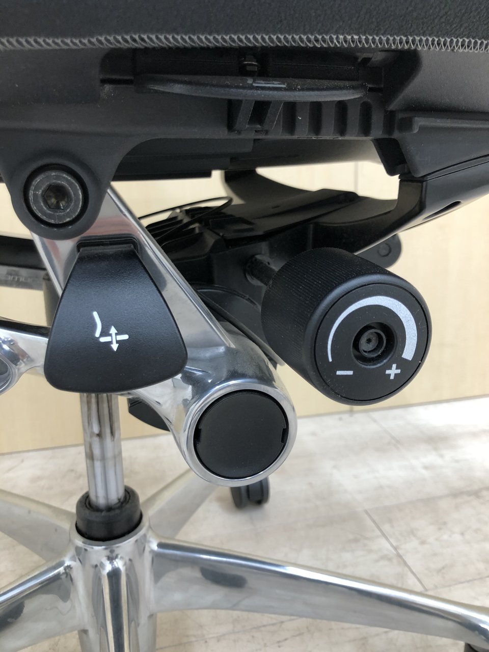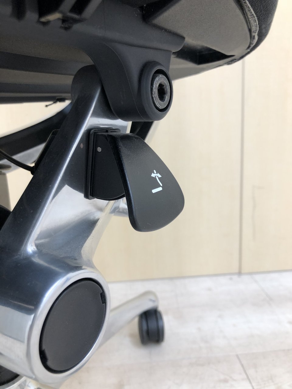 - 身体にフィットする自然な動きを実現するアンクルチルト®リクライニング。座面左下のレバーでお好みの角度に固定できます。 リクライニングの強弱は無段階で調整可能です。