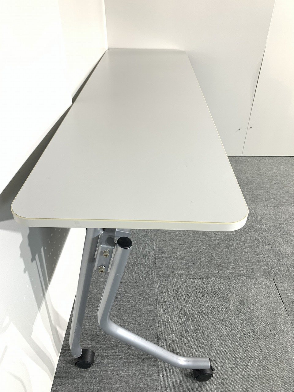 - 一部不具合あり天板歪み、アジャスター無し、キャスター使用不可ようなそのテーブルの本来の効用を果たすための機能以外の一部が使用不可な状態。(例、キャスターロッ ク機能使用不可、棚板無し等がある。)