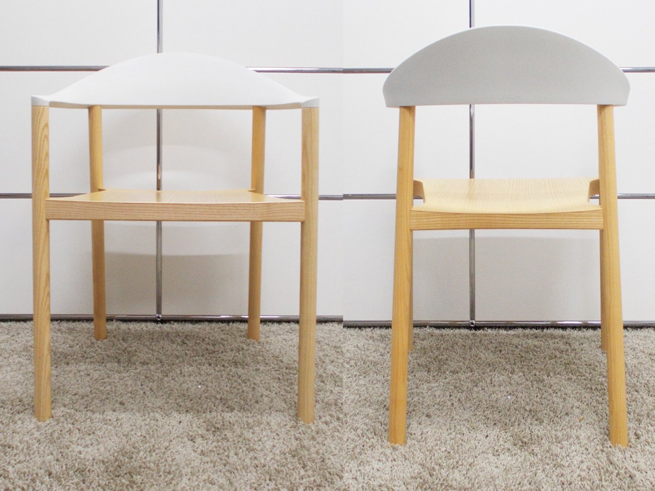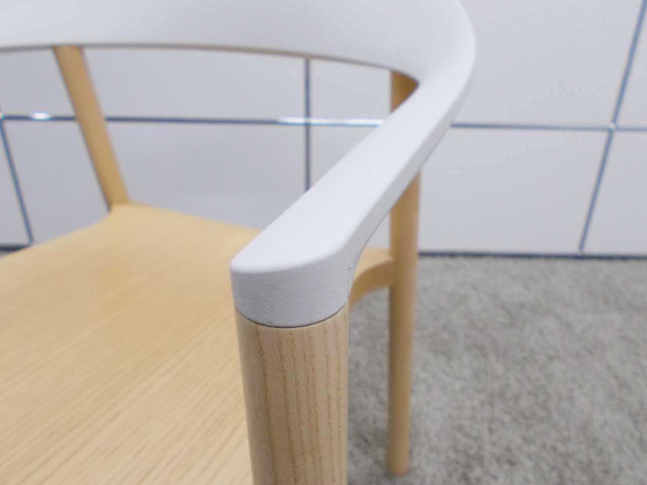 ゆるやかなカーブを描く一体型の背とアームが印象的なミニマルなデザインです。 ウッドとプラスチックという異素材を組み合わせたアームチェアはスタッキングしても美しい佇まいです。