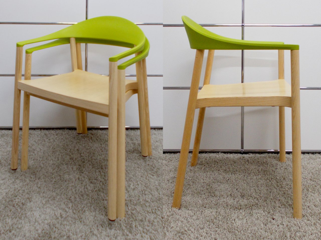 ゆるやかなカーブを描く一体型の背とアームが印象的なミニマルなデザインです。 ウッドとプラスチックという異素材を組み合わせたアームチェアはスタッキングしても美しい佇まいです。