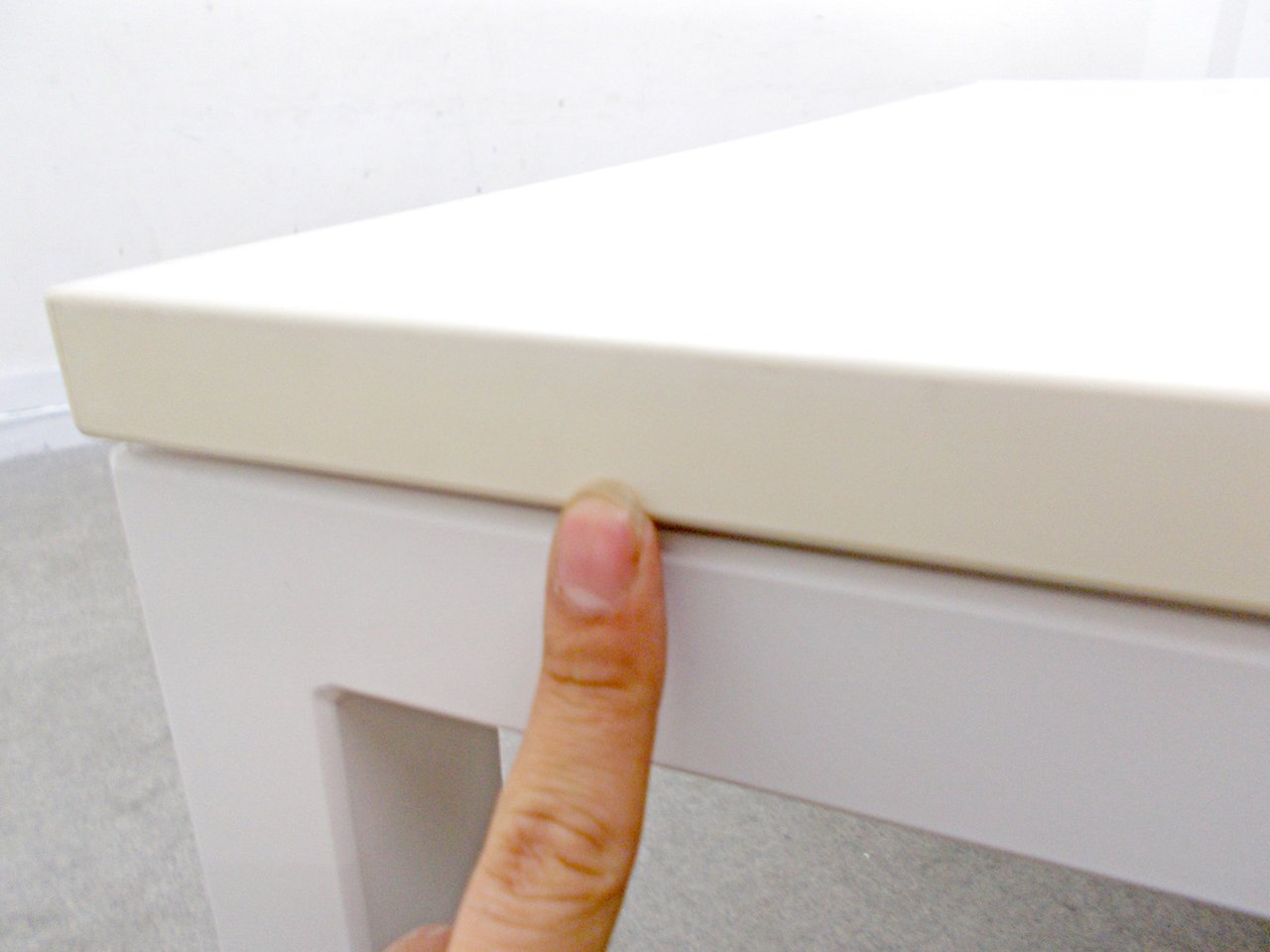 - 目立つ箇所複数あり深い傷・凹みが商品全体にある。(例、天板、幕板、棚板、サイド部分、脚部等にある。)