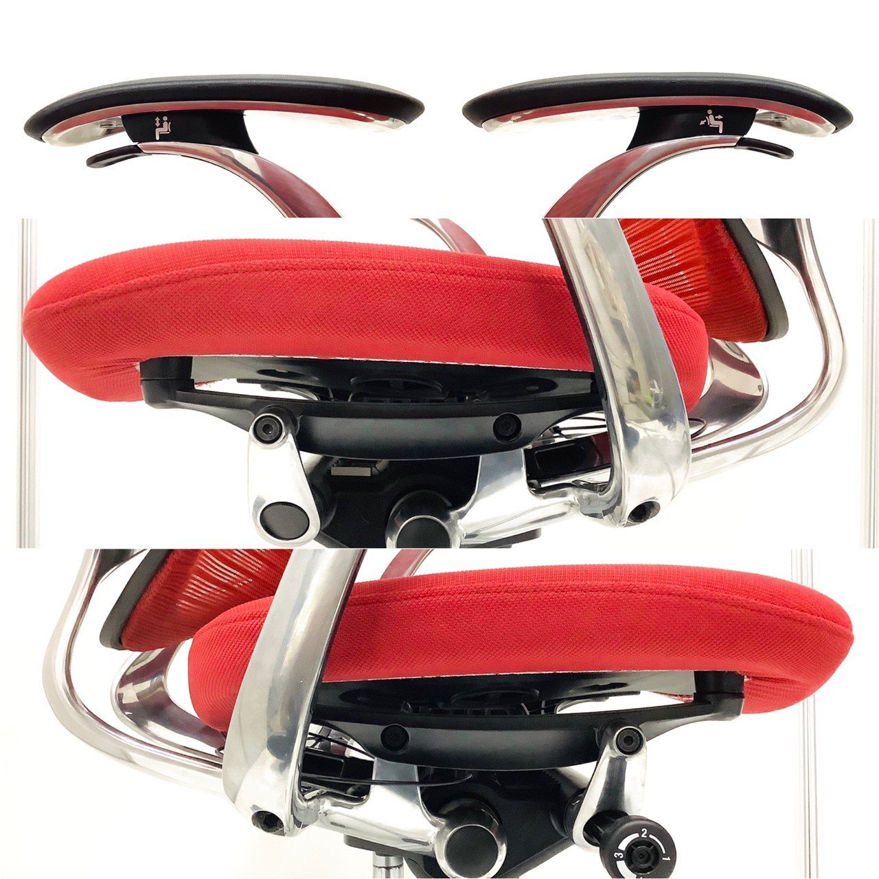 - 座面の前後スライド調整レバーで操作(前後50mm分調整で)できます。(グラデーションサポートメッシュタイプを除く)