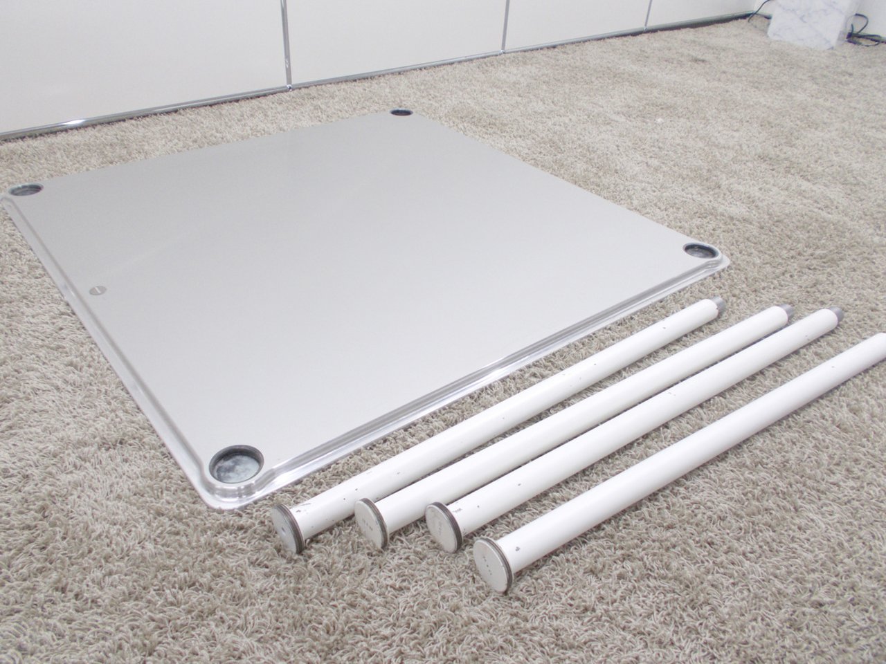 - 一部不具合あり天板歪み、アジャスター無し、キャスター使用不可ようなそのテーブルの本来の効用を果たすための機能以外の一部が使用不可な状態。(例、キャスターロッ ク機能使用不可、棚板無し等がある。)