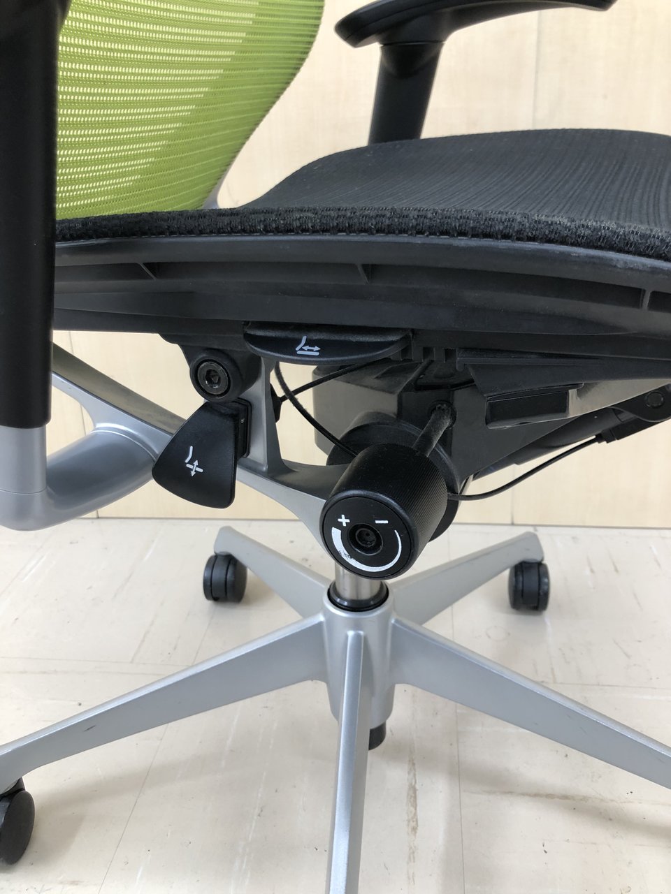 - 座面の右下にあるレバーの操作により座面位置を上下に100mm分調整することが可能です。