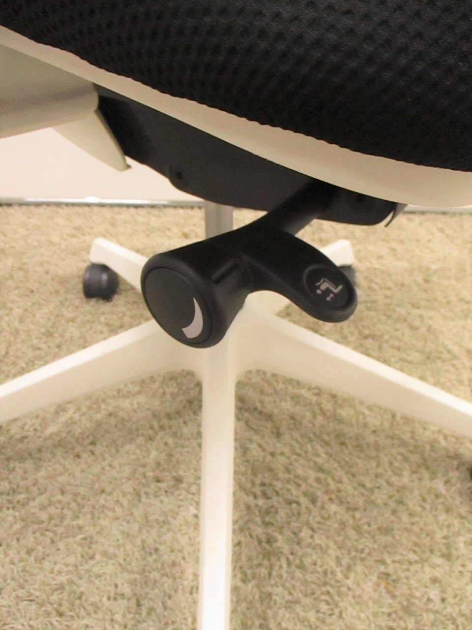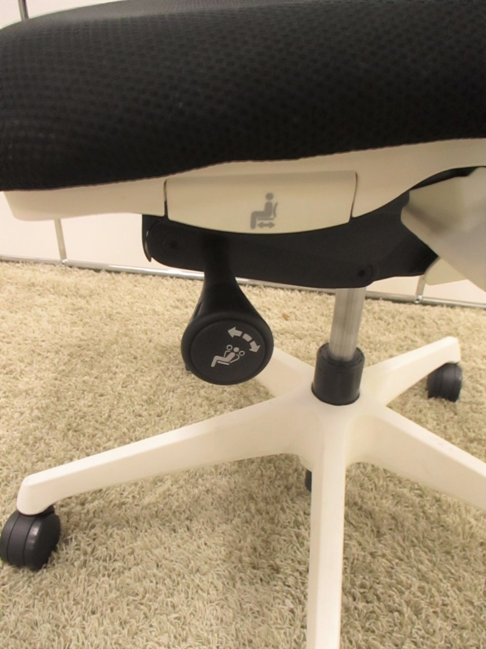 - 座面右下のダイヤル操作で、リクライニングの強弱調整が行えます。これまでのダイヤル式よりも、少ない回転数で、最弱?最強の調整が可能です。