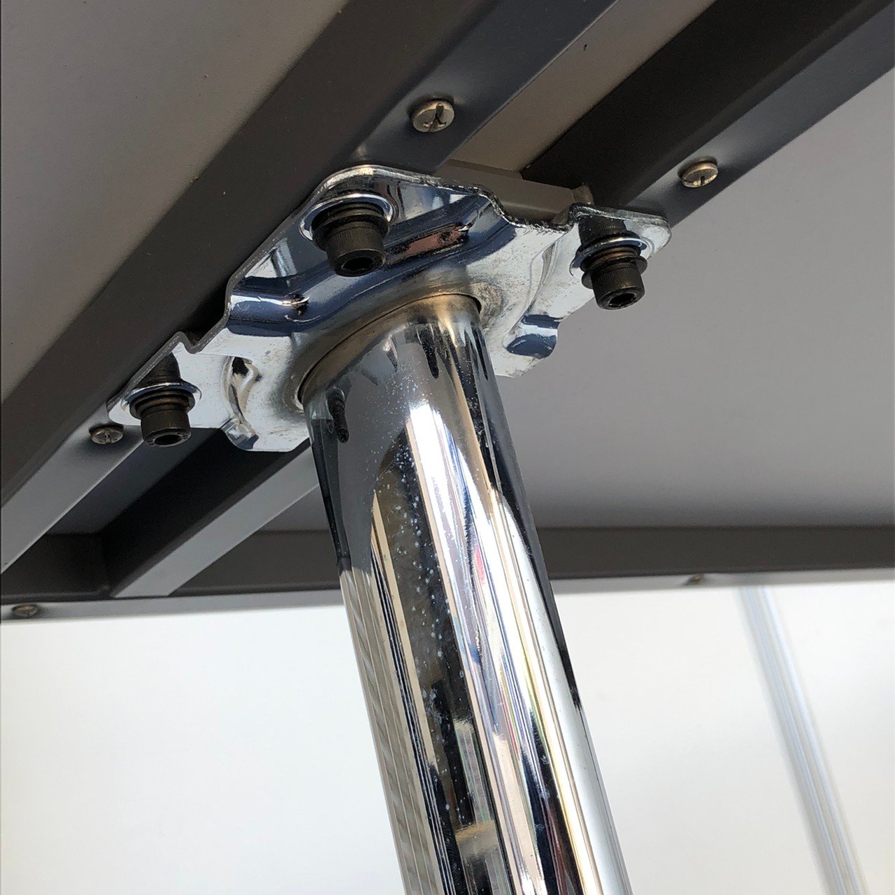 ステンレスのT字脚のテーブルとシックな色合いのチェアのセットとなります。