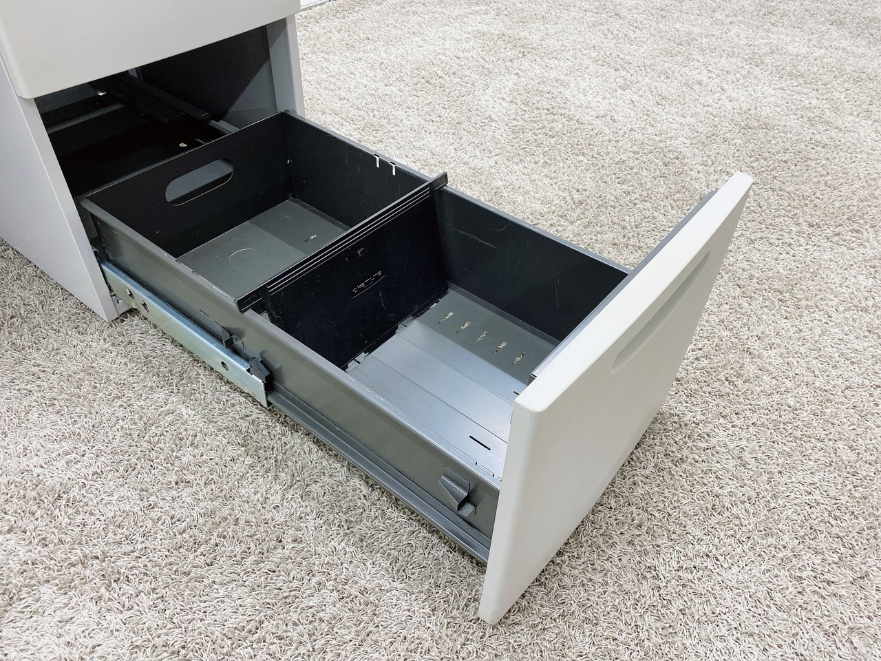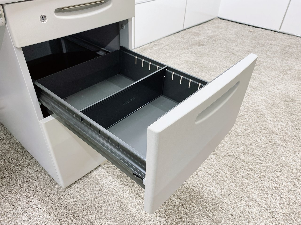 - 袖机のワゴンは、最下段がロング引出しになっており、従来より収納力120%アップ。